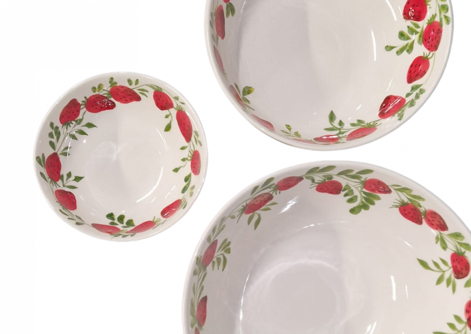 Vrolijk en fruitig – de Aardbei Kom Gadia van Piccobella Italiaans servies is een kleurrijke toevoeging aan iedere tafel. De handbeschilderde kommen zijn gedecoreerd met sappige rode aardbeien en groene takjes, waardoor ze direct een zomerse sfeer oproepen.
