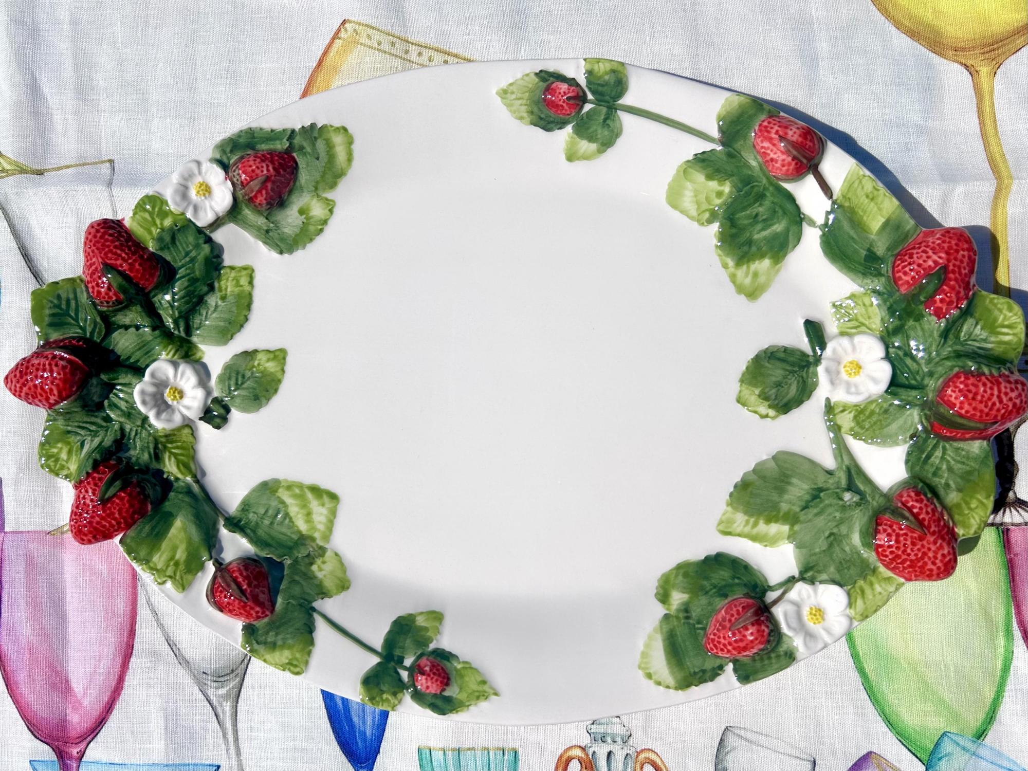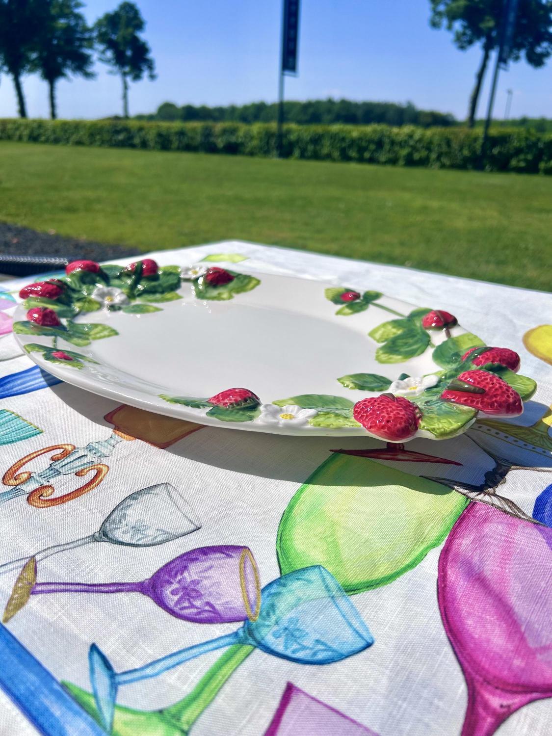Deze handbeschilderde ovale aardbeienschaal van Piccobella brengt direct een frisse en zomerse sfeer aan tafel. Het sierlijke ontwerp met rode aardbeien, groene bladeren en subtiele bloemetjes maakt deze schaal tot een echte blikvanger.
