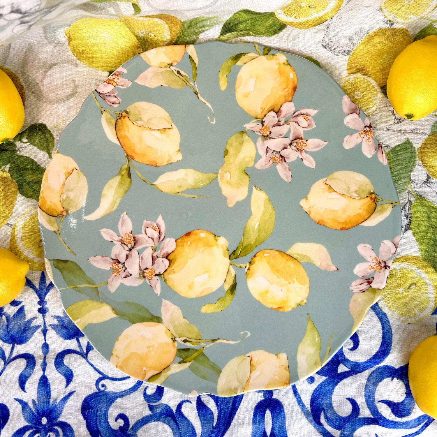 Een imposante basis voor elke setting. Dit royale onderbord vormt het stralende middelpunt van je tafel, met handgeschilderde citroendetails en een glanzende kobaltblauwe rand. Perfect als serveerplateau of om je tafeldekking extra cachet te geven.