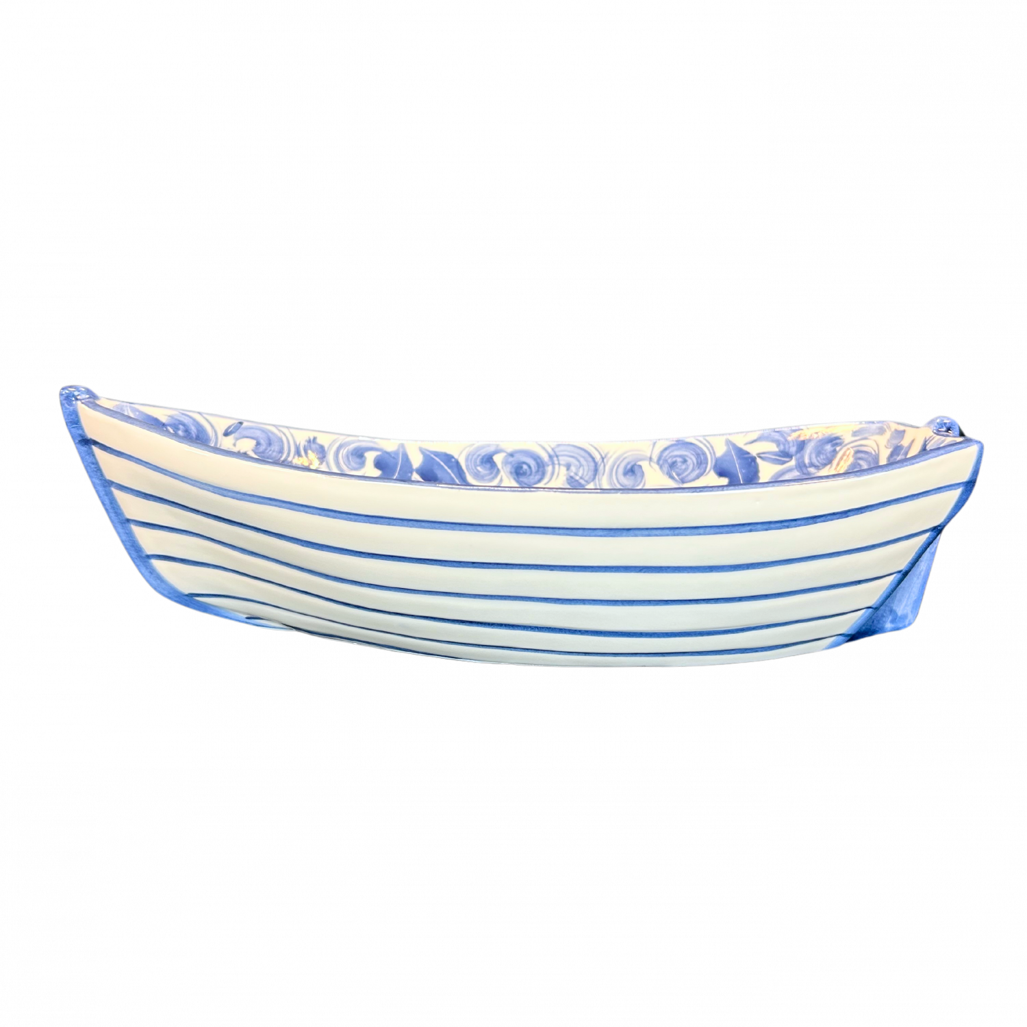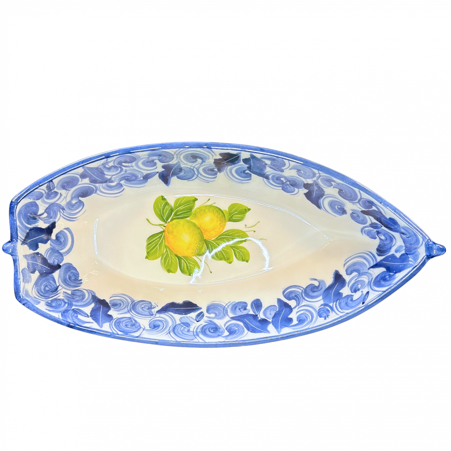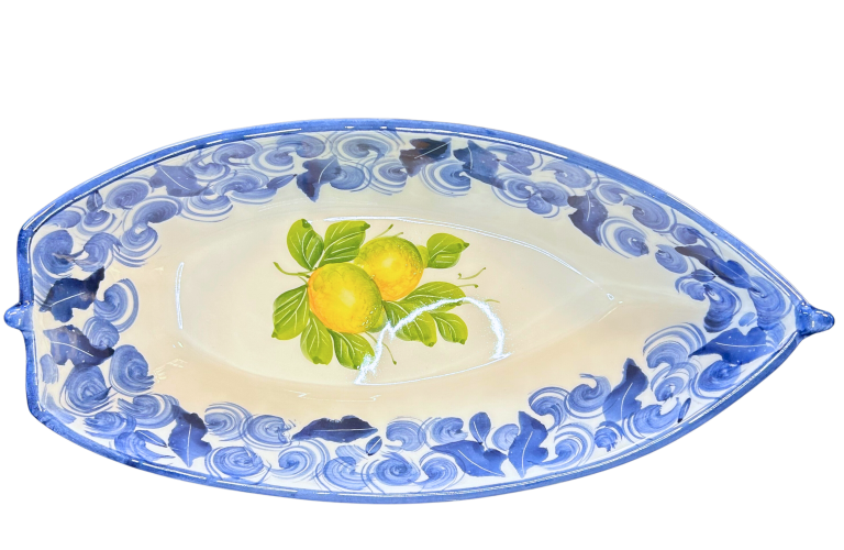 Serveer je pasta op een bijzondere manier met de Damascato Spaghetti Boot uit de elegante Damascato collectie van Piccobella Italiaans servies. Deze handbeschilderde schaal, vormgegeven als een boot, is gedecoreerd met blauwe patronen en een frisse citroen in het midden – een perfecte mix van klassiek en mediterraan.