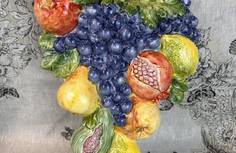 Breng een vleugje mediterrane charme in je interieur met deze prachtige handgemaakte keramieken hanger uit Italië. Deze unieke wanddecoratie is rijk gedetailleerd en vormt een weelderige tros fruit, waaronder druiven, granaatappels, citroen, peer, vijg en appel. De levendige kleuren en glanzende afwerking maken het een echte blikvanger in elke keuken, eetkamer of wijnkelder.