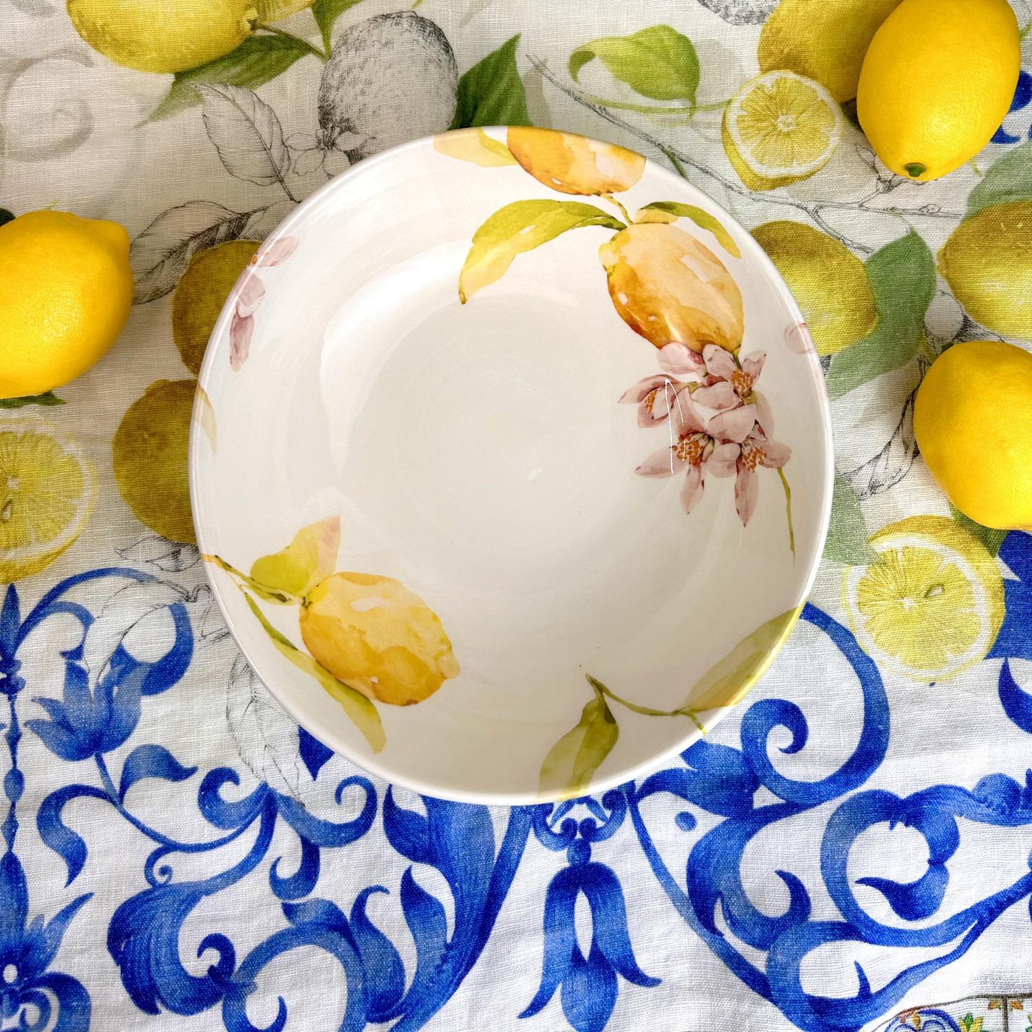 Een imposante basis voor elke setting. Dit royale onderbord vormt het stralende middelpunt van je tafel, met handgeschilderde citroendetails en een glanzende kobaltblauwe rand. Perfect als serveerplateau of om je tafeldekking extra cachet te geven.