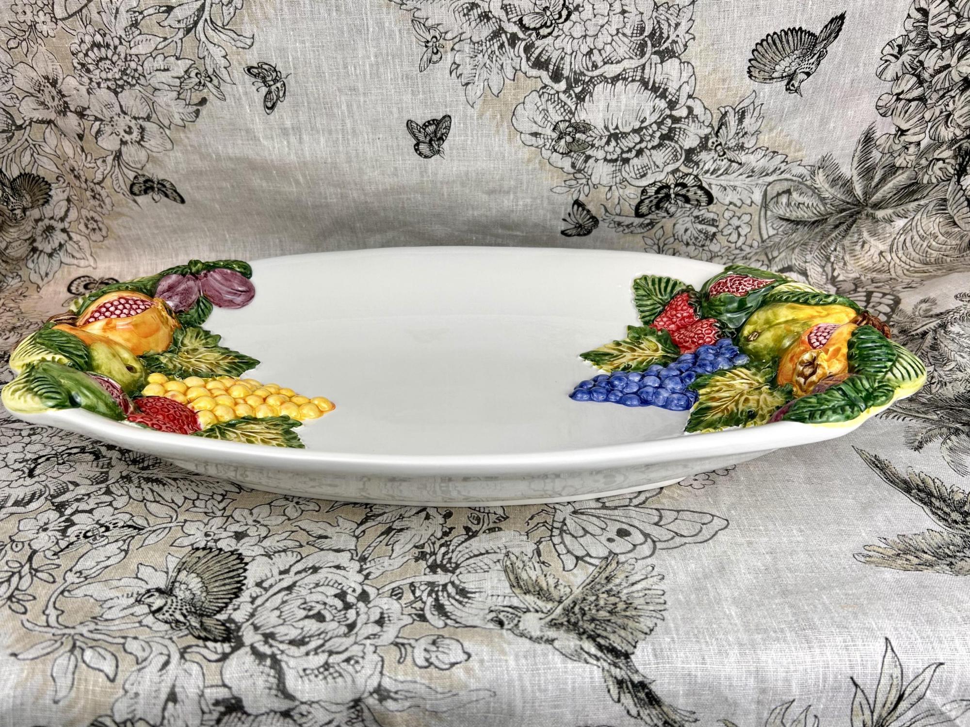 Voeg een kleurrijke en stijlvolle touch toe aan je tafel met dit handgemaakte keramieken serveerbord uit Italië. Het ovale bord is rijkelijk versierd met gedetailleerde fruitmotieven aan beide uiteinden – van druiven en vijgen tot granaatappels, peren en citrusvruchten – allemaal uitgevoerd in levendige kleuren en met de hand beschilderd.