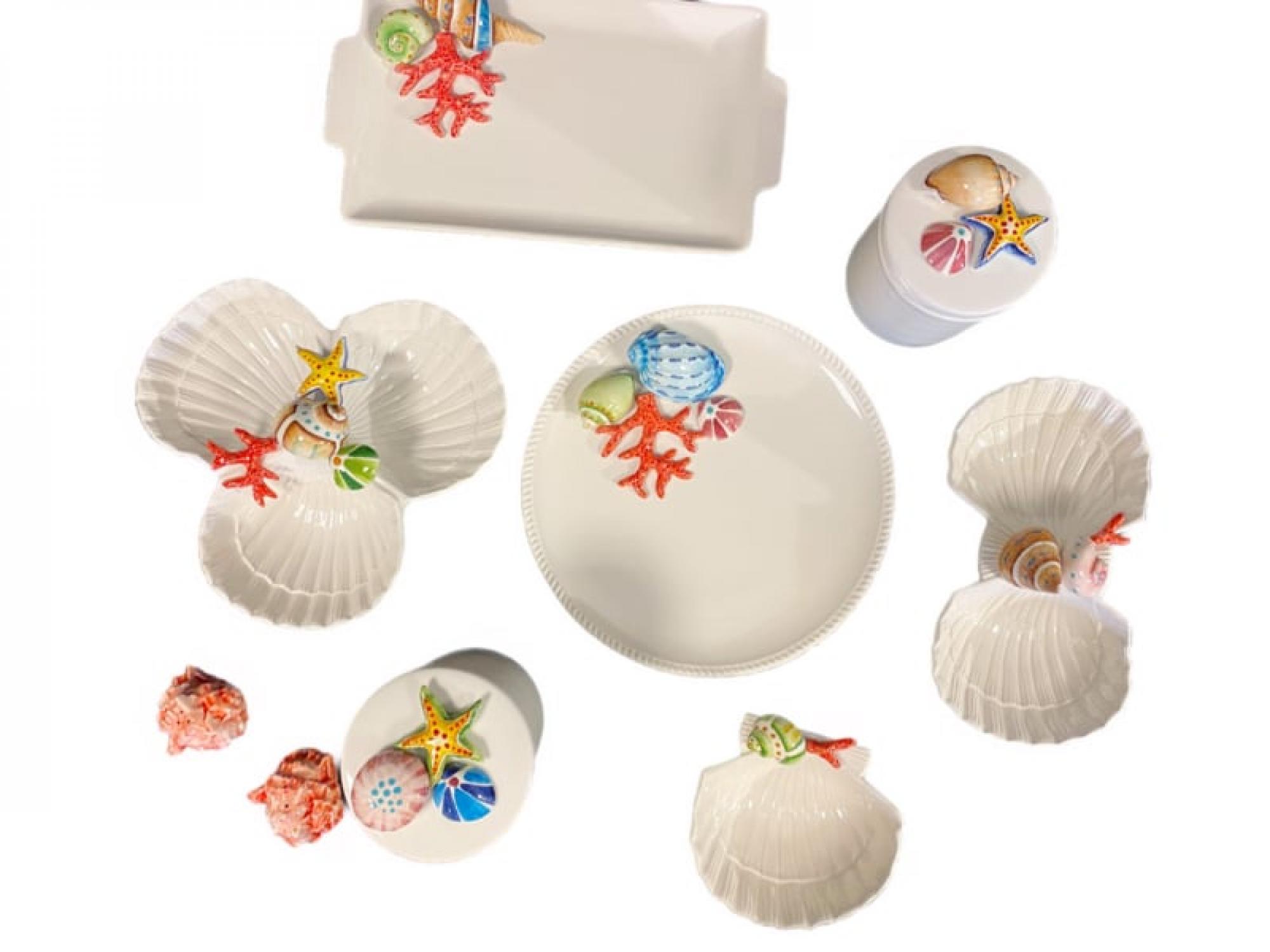 Een elegante rechthoekige schaal uit de Conchiglia Collectie, met de hand gemaakt en beschilderd in Italië. Versierd met prachtige schelpen, koraal en zeedetails in tinten van turquoise, oranje en zachtgroen — geïnspireerd op de kleurrijke onderwaterwereld van de Middellandse Zee.