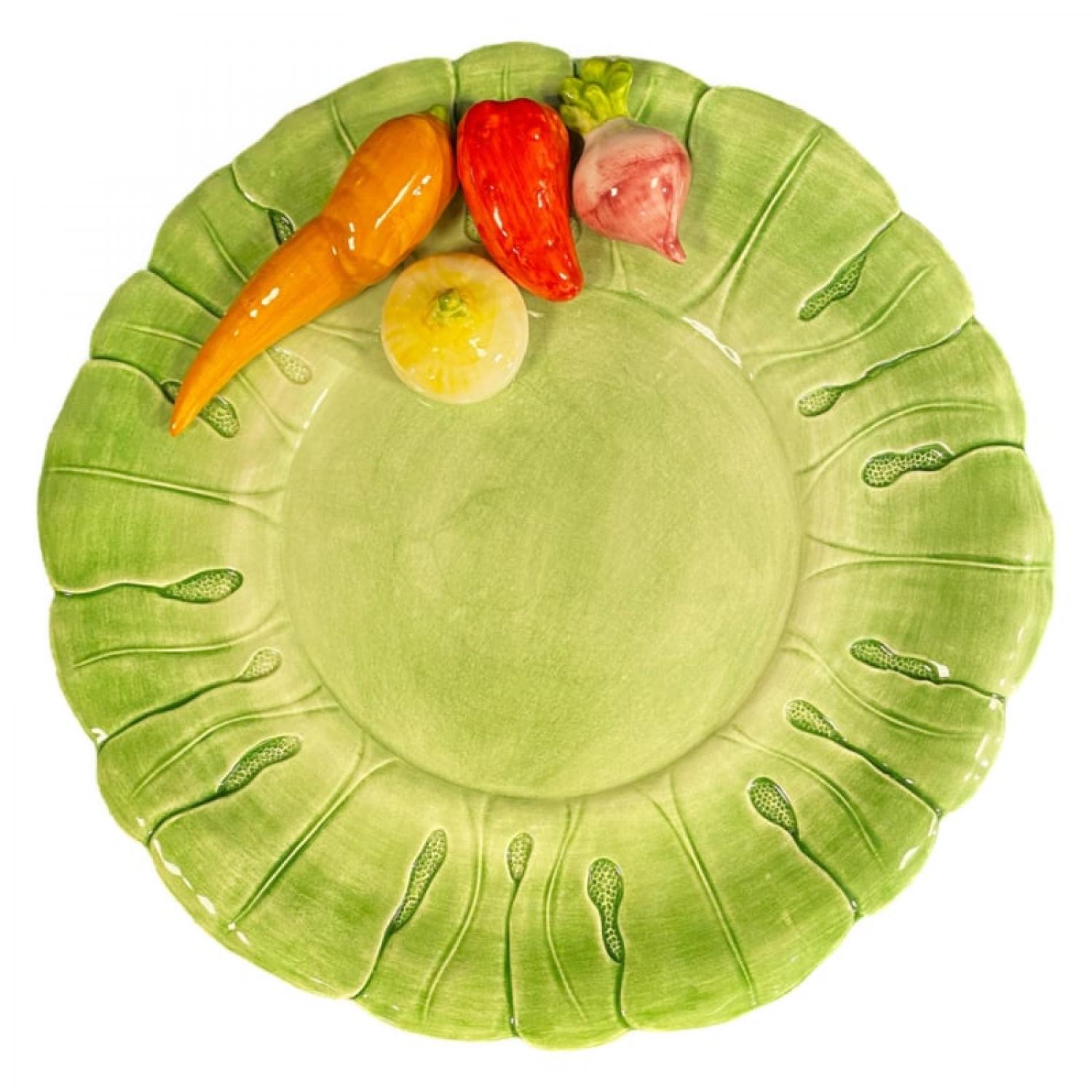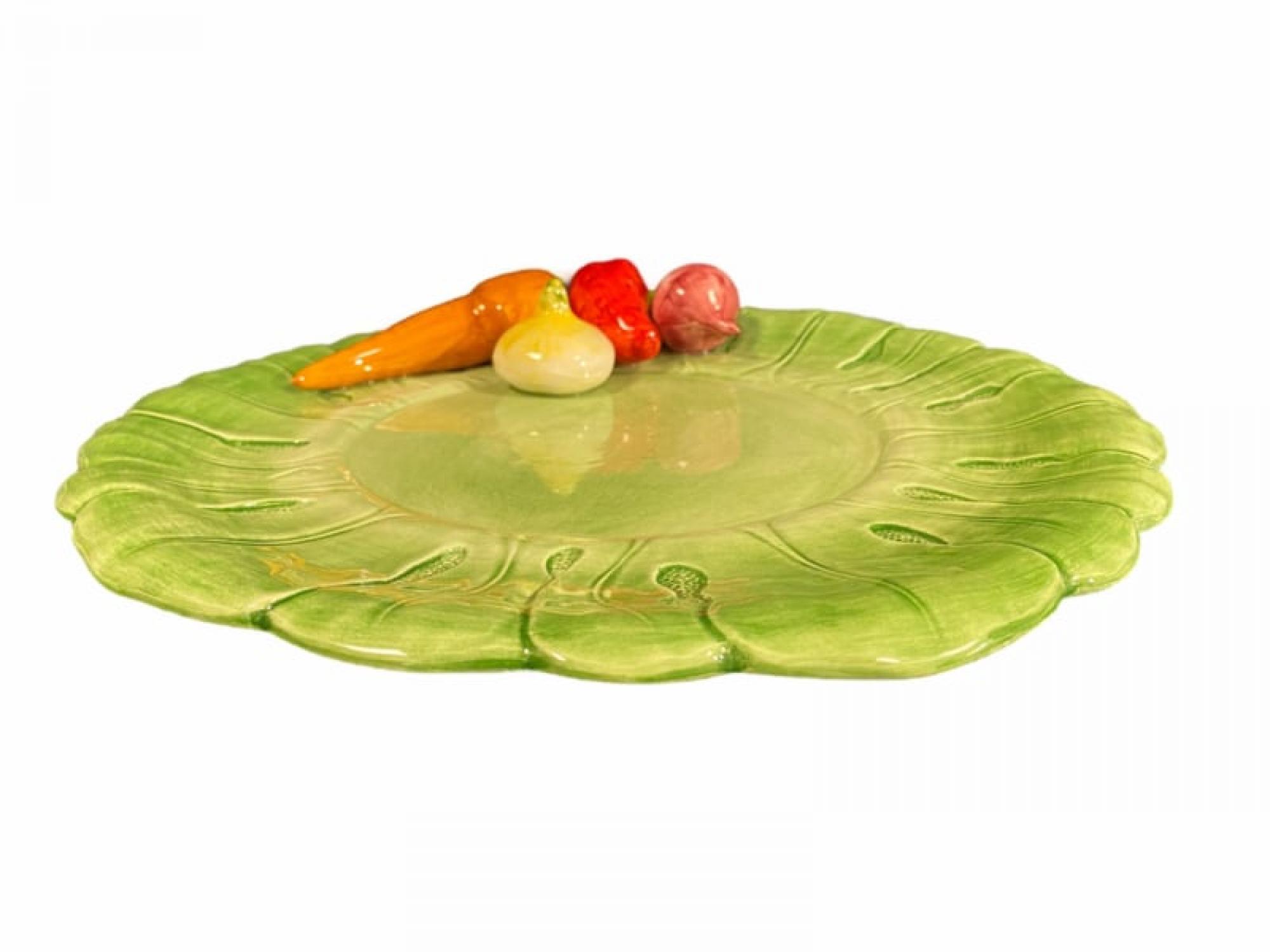 Een sfeervolle ronde presenteerschaal uit de Groente Collectie, handgemaakt en beschilderd in Italië. Versierd met kleurrijke groenten zoals wortel, paprika en artisjok op een frisgroene bladvormige schaal — een echte blikvanger op tafel.