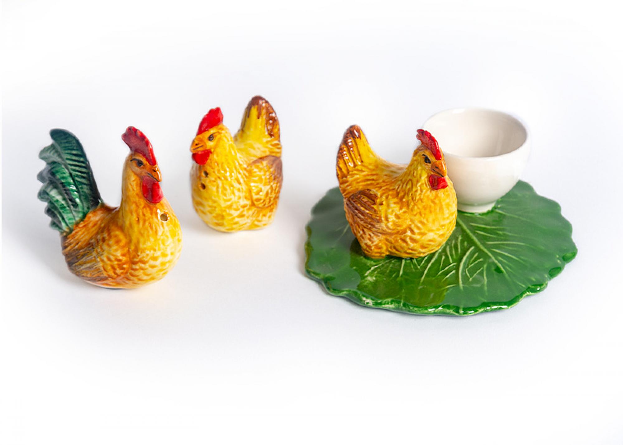 Een charmant peper- en zoutstel uit de Boerderij Collectie, volledig handgemaakt en beschilderd in Italië. De vrolijke kip en haan brengen een warme, landelijke sfeer aan tafel — perfect voor liefhebbers van ambacht en detail.