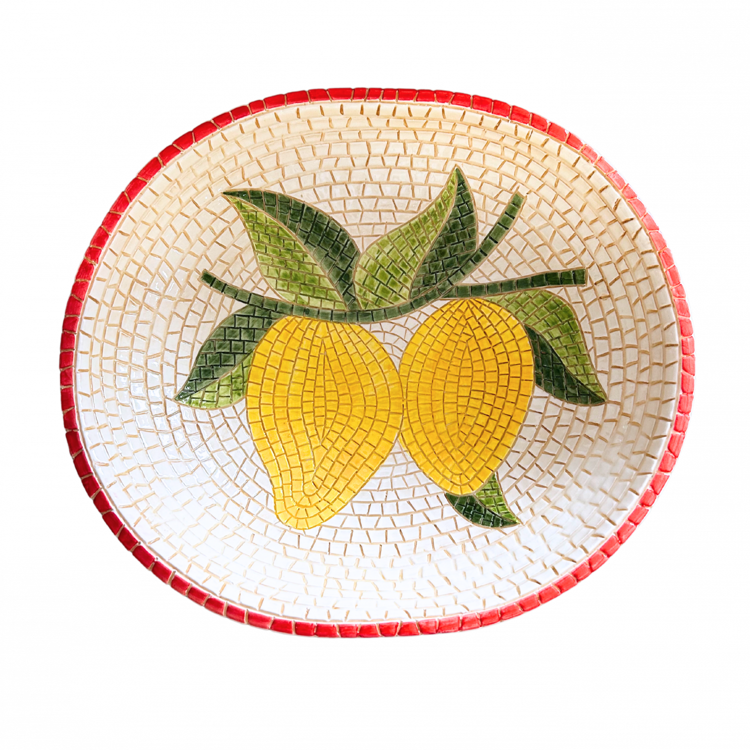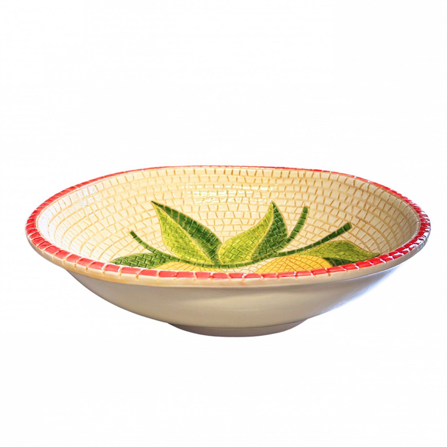 Een unieke saladekom uit de Mozaïek Collectie, met de hand gemaakt en beschilderd in Italië. Het mozaïekpatroon met citroenen en groene bladeren straalt pure mediterrane charme uit, terwijl de rode rand zorgt voor een vrolijke en frisse uitstraling.