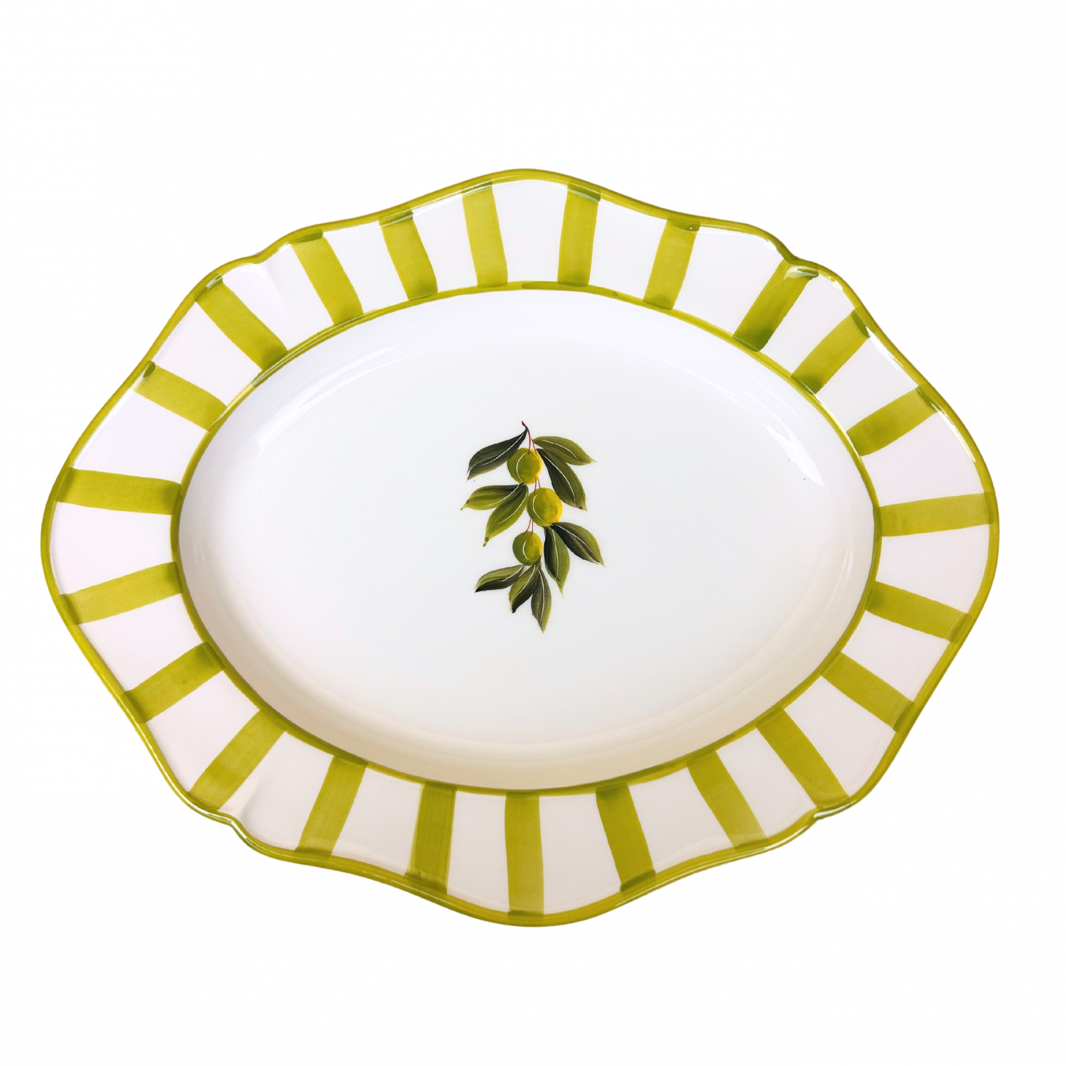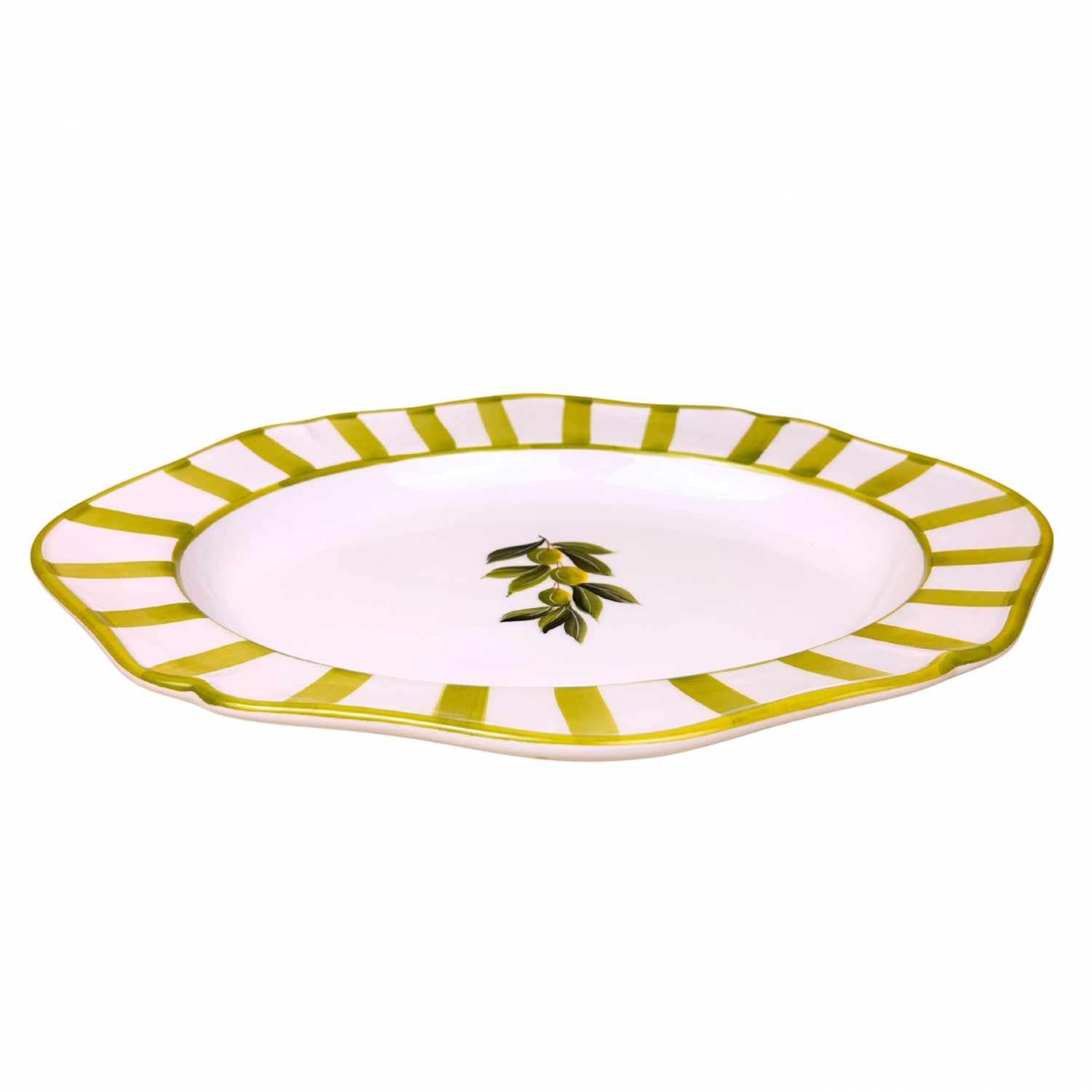 De Collezione Olive a Righe brengt de zonnige sfeer van Zuid-Italië naar je tafel. Elk item is gedecoreerd met een prachtige handbeschilderde olijf in het midden, omringd door een luxe beige-gouden penseelstrepenrand. De golvende randen en zachte tinten geven deze serie een elegante, tijdloze uitstraling.