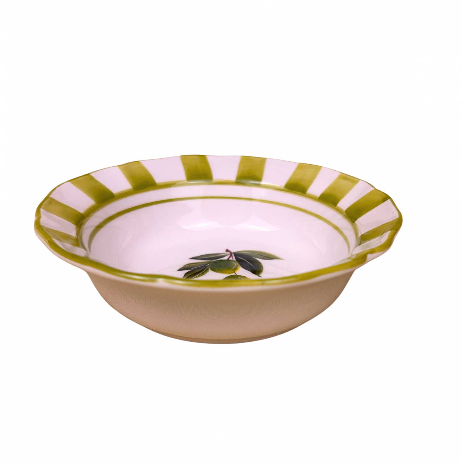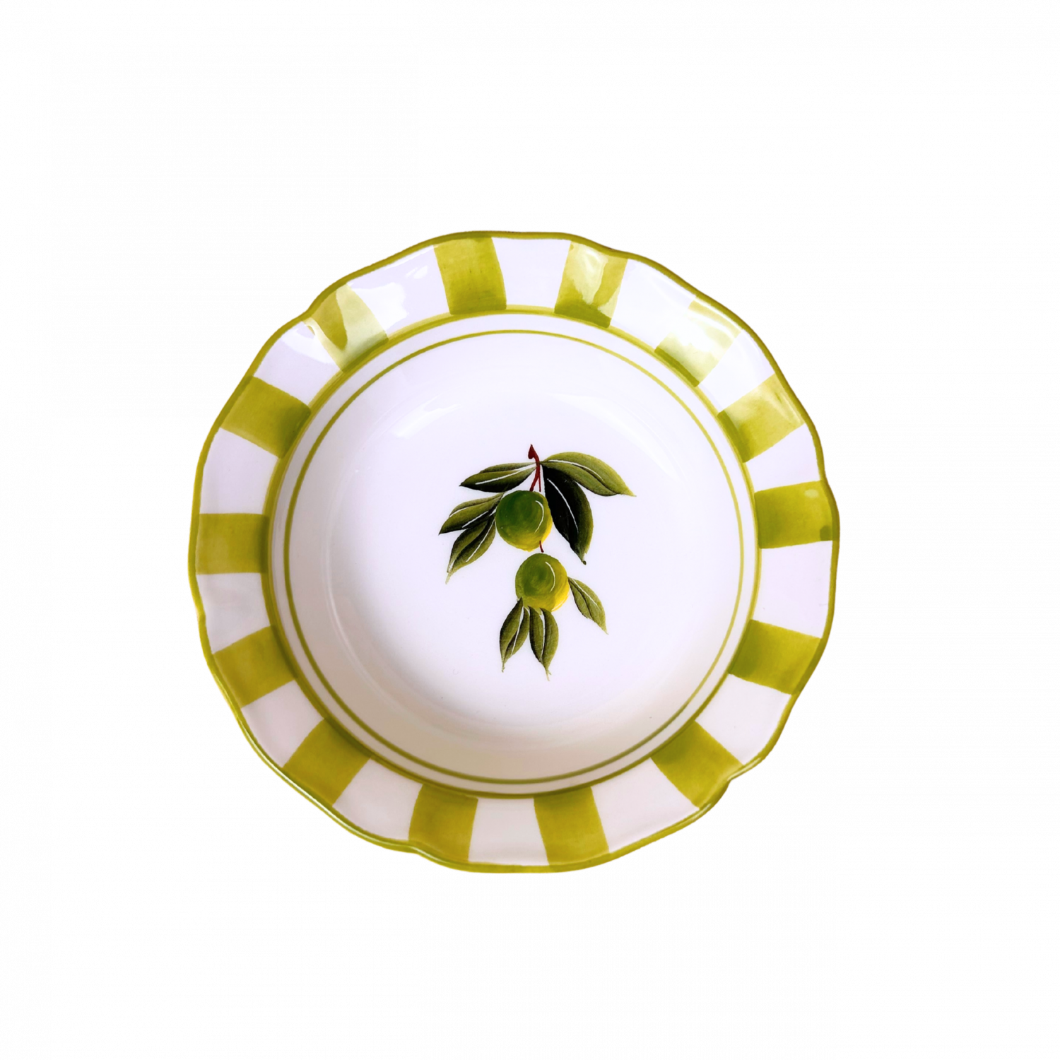 De Collezione Olive a Righe brengt de zonnige sfeer van Zuid-Italië naar je tafel. Elk item is gedecoreerd met een prachtige handbeschilderde olijf in het midden, omringd door een luxe beige-gouden penseelstrepenrand. De golvende randen en zachte tinten geven deze serie een elegante, tijdloze uitstraling.
