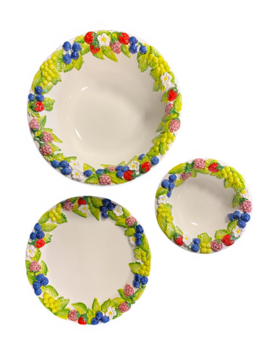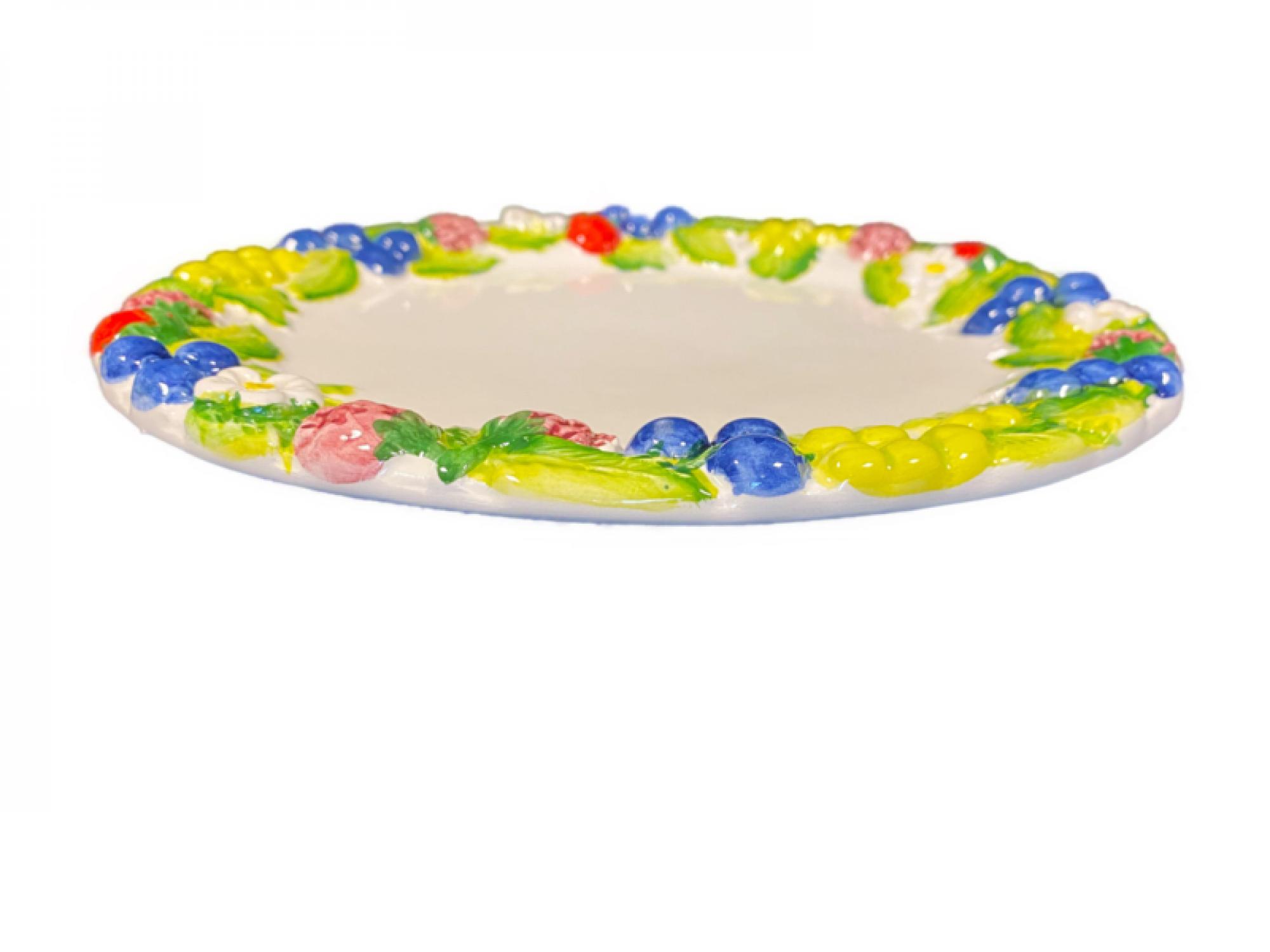 Een kleurrijk en zomers ontbijt- of gebaksbord met een rand vol handbeschilderd fruit — van druiven en aardbeien tot bramen en frambozen. Elk detail is met zorg aangebracht door Italiaanse vakmensen, waardoor elk bord een klein kunstwerkje is.