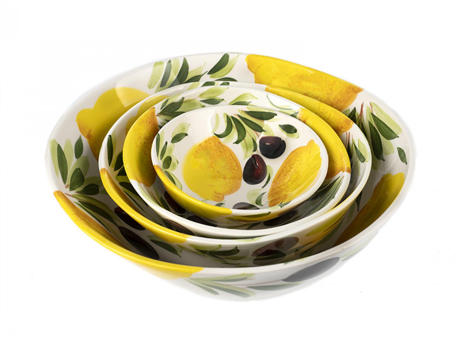 Een charmante organische schaal met handbeschilderde citroenen en olijven, gemaakt door Italiaanse ambachtslieden. De zachte, natuurlijke vorm en levendige kleuren brengen direct de sfeer van Zuid-Italië op tafel.