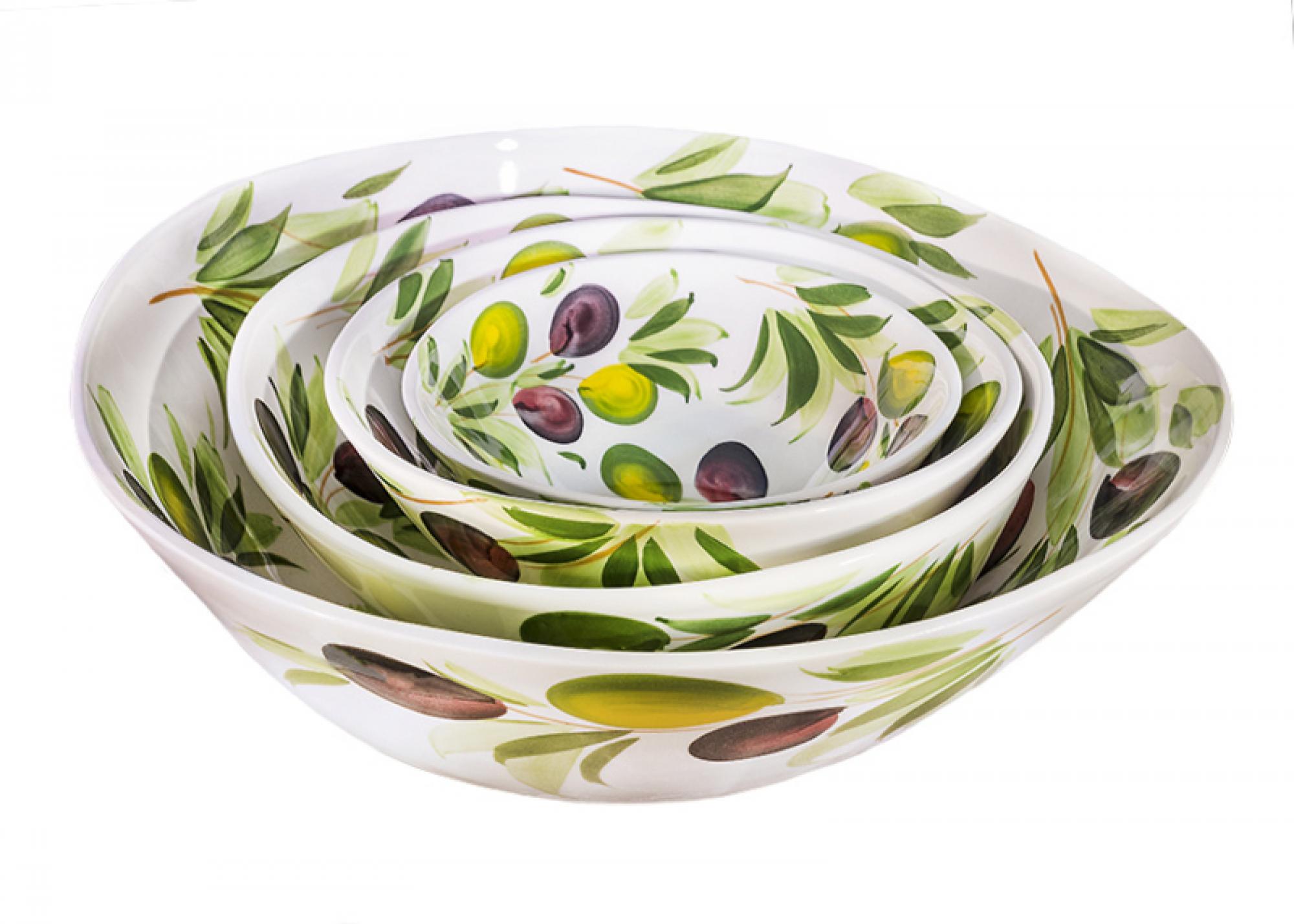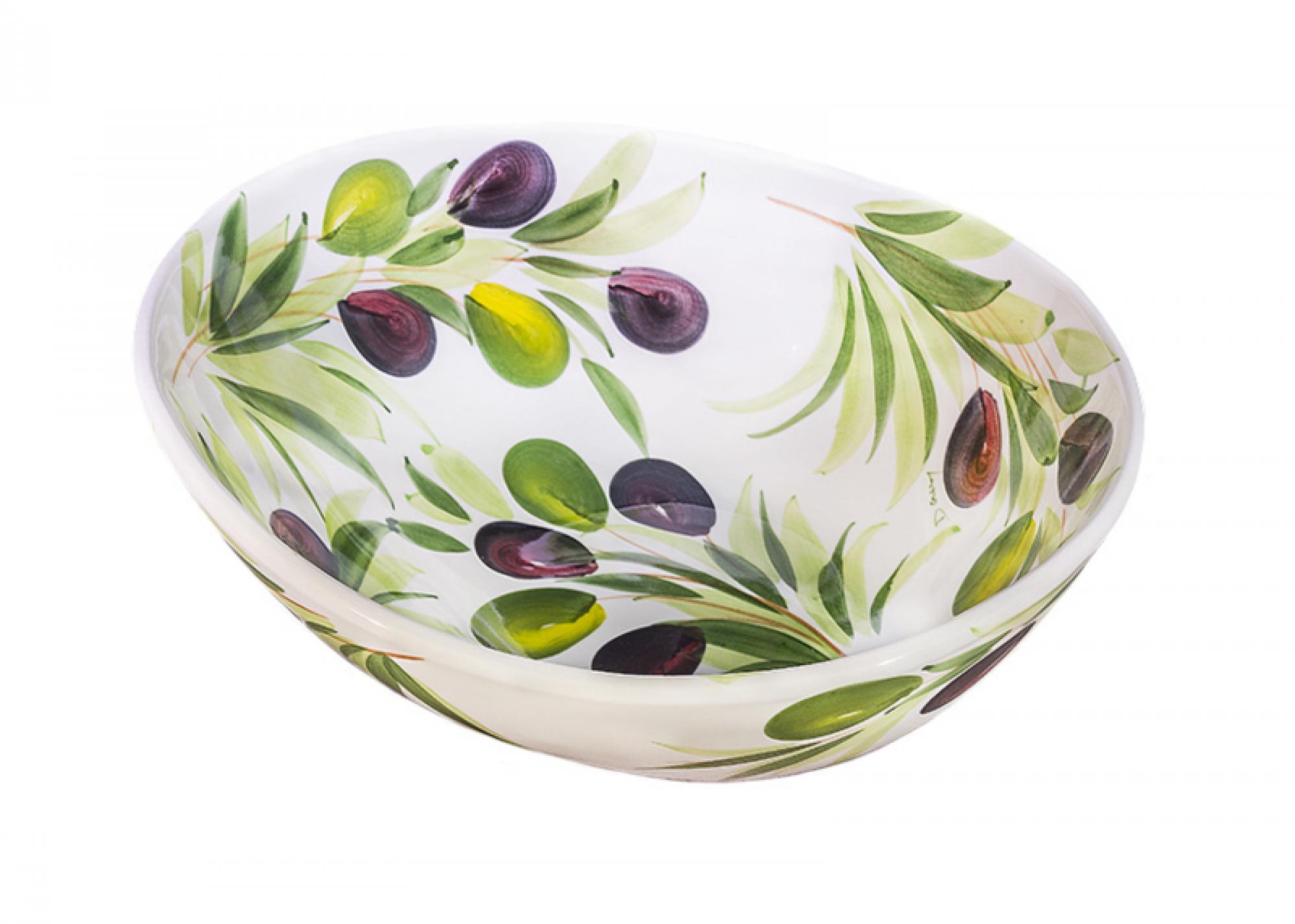Een elegante grote schaal uit de Olijf Collectie, met levendige handgeschilderde olijven en bladeren. Ideaal voor het serveren van pasta, salades of fruit, of als decoratief middelpunt op tafel.