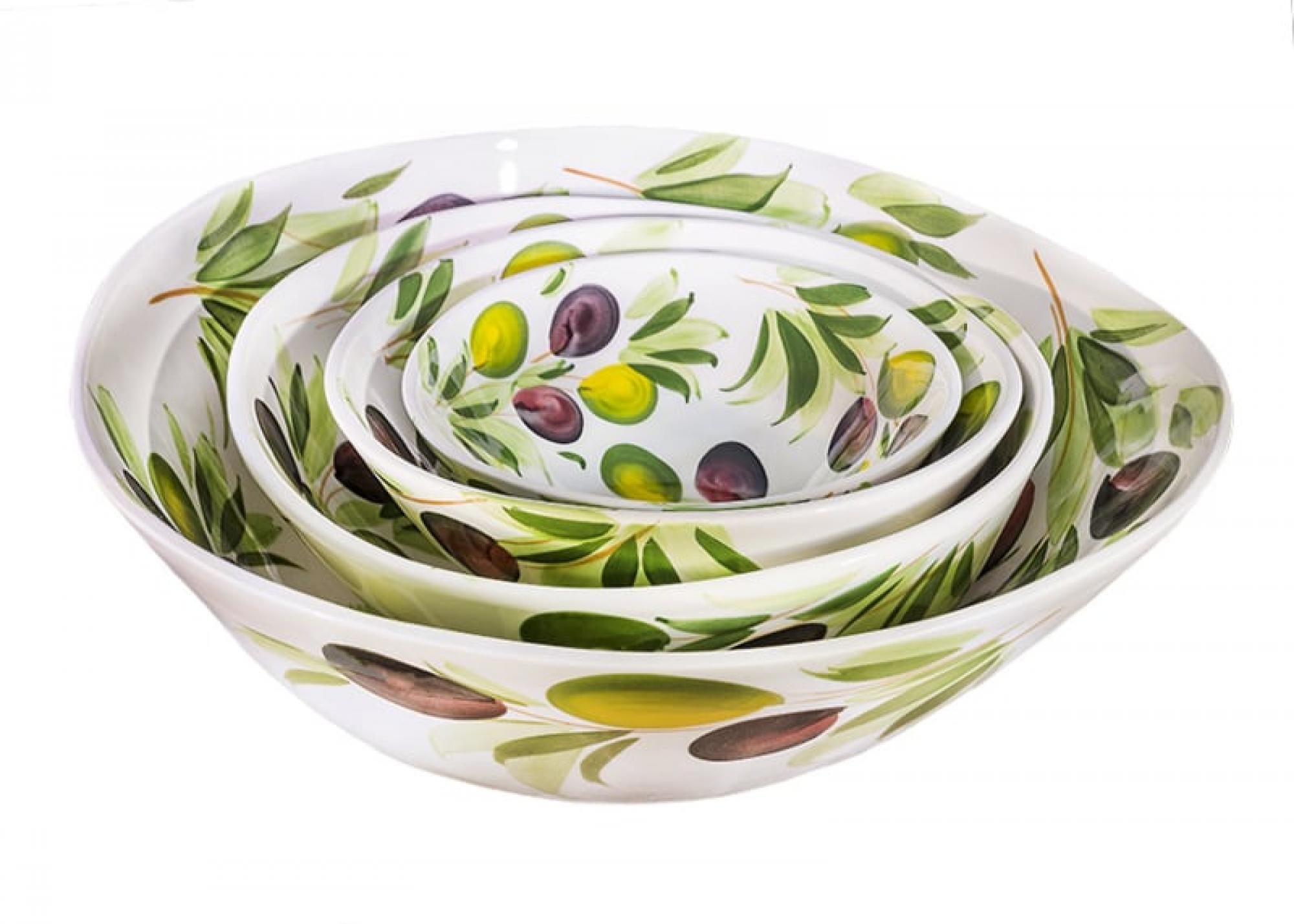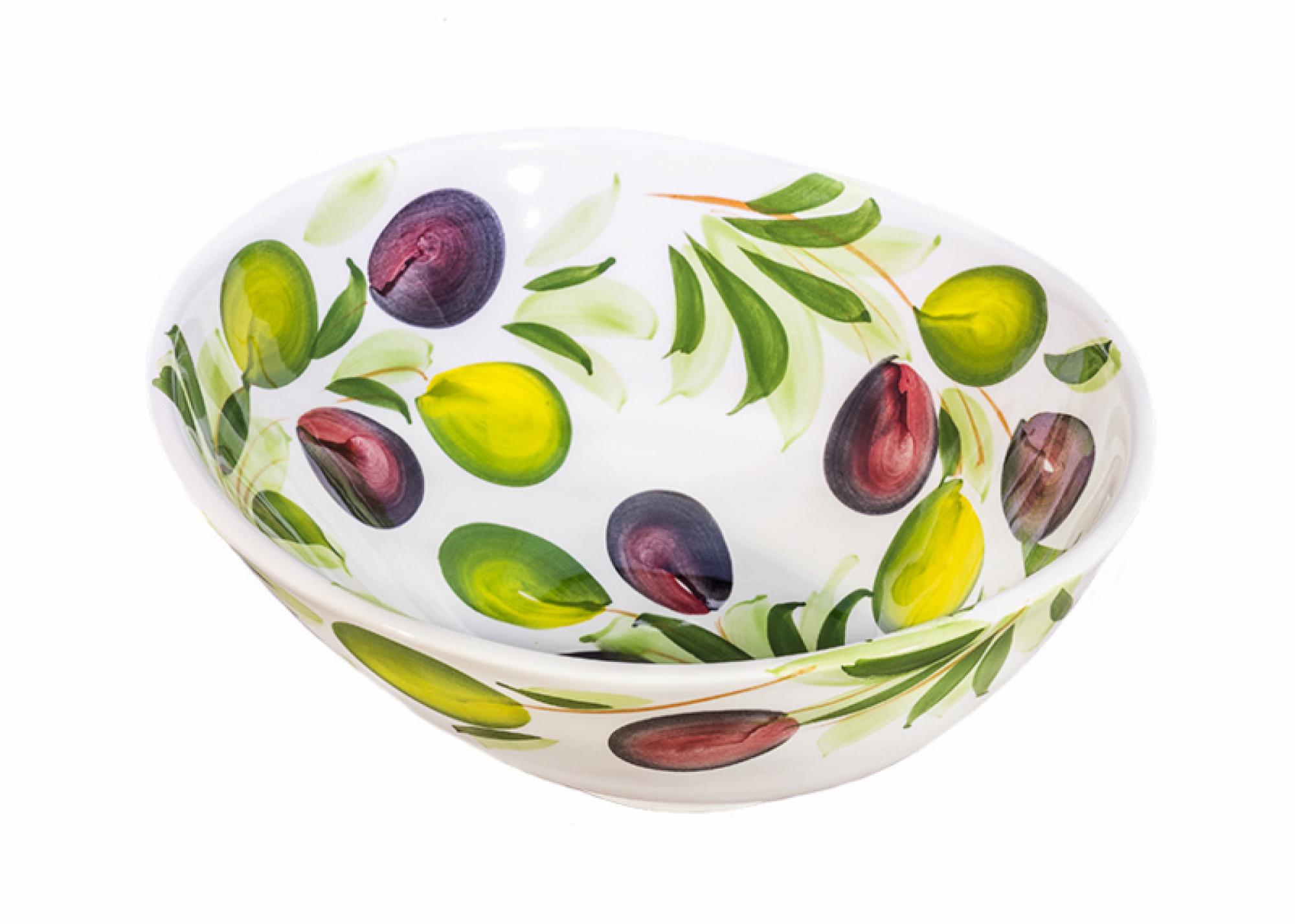 Een stijlvolle middelgrote schaal met een natuurlijke, golvende vorm en een handbeschilderd olijftakkenmotief. Deze schaal ademt Italiaanse warmte en eenvoud — perfect voor antipasti, brood of salades.