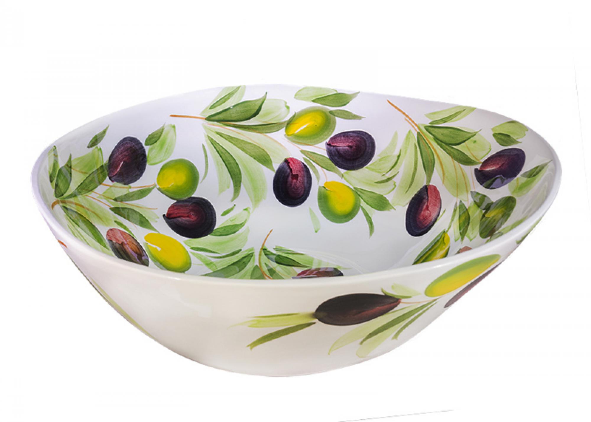 Een royale serveerschaal met een natuurlijke, organische vorm, rijk beschilderd met groene en paarse olijven. Een echte blikvanger op tafel — perfect voor grote salades, gerechten of decoratief gebruik.