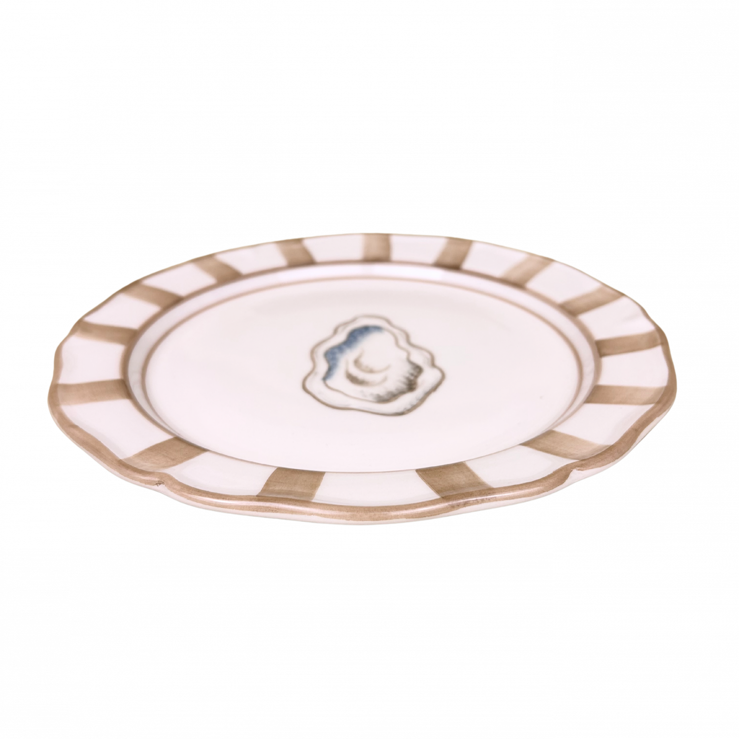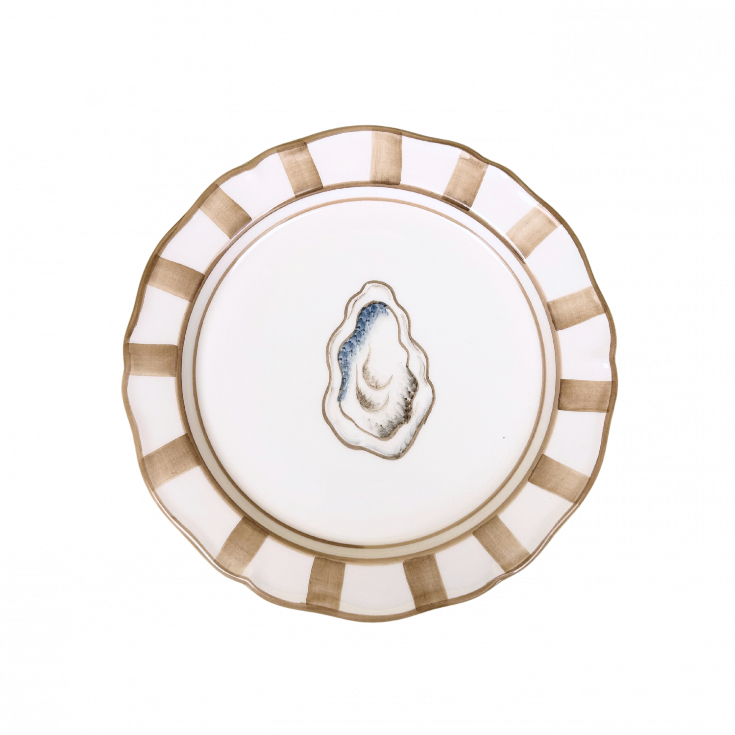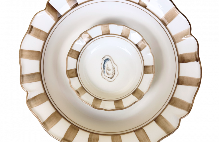 De Ostrica Serie is een elegante, luxe servieslijn met een handgeschilderde oester in het midden en een stijlvolle beige-gouden penseelstrepenrand. Deze collectie wordt volledig met de hand gemaakt in Italië en heeft een tijdloze, chique uitstraling die perfect past bij zowel dagelijks gebruik als feestelijke tafelsettings.