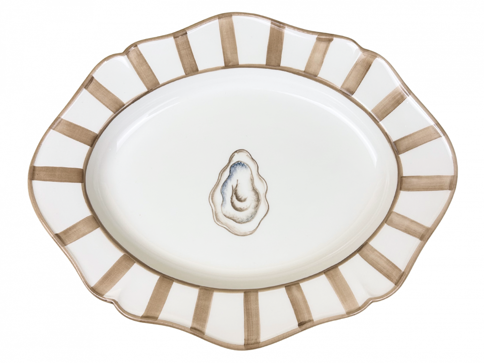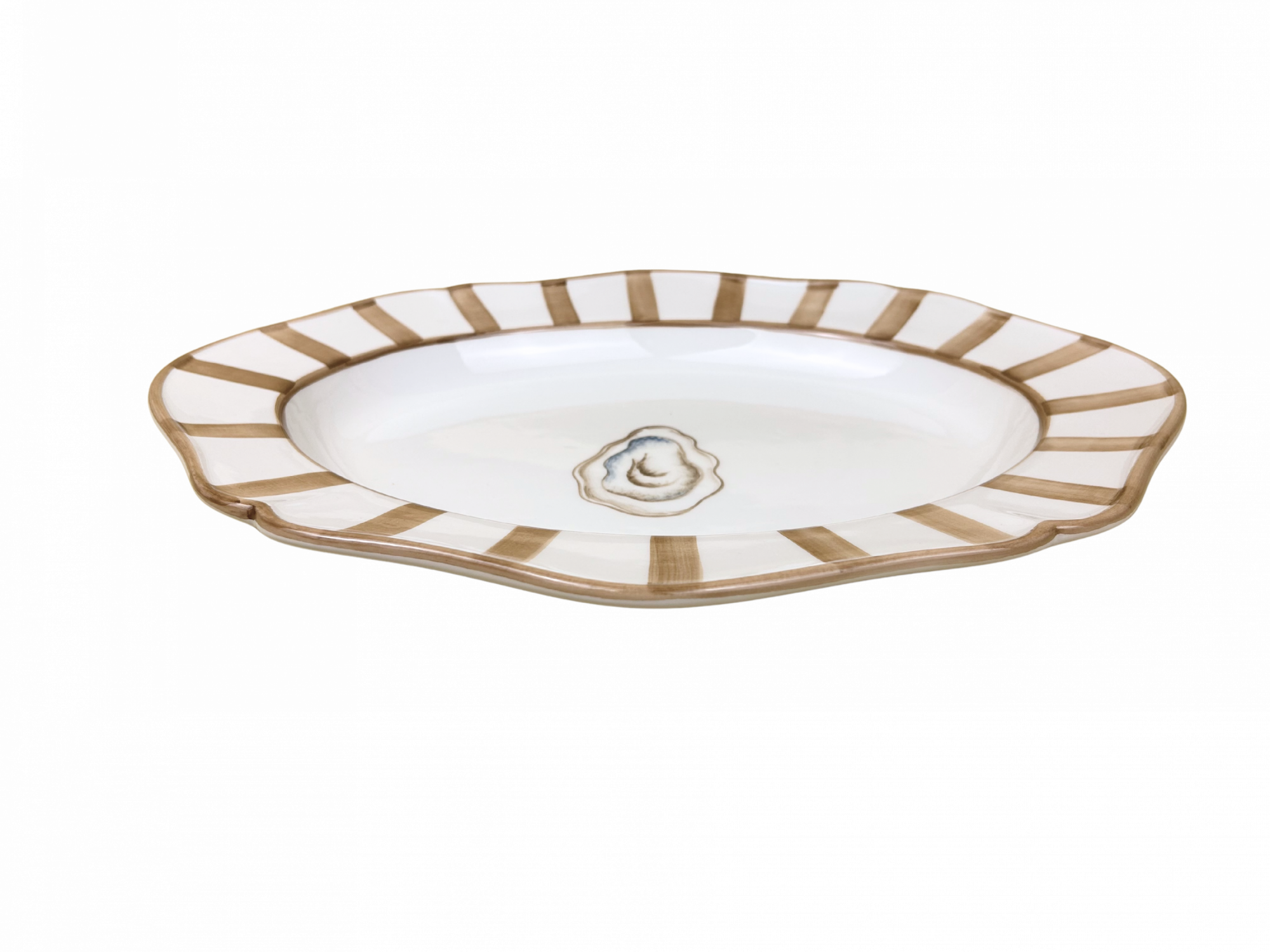De Ostrica Serie is een elegante, luxe servieslijn met een handgeschilderde oester in het midden en een stijlvolle beige-gouden penseelstrepenrand. Deze collectie wordt volledig met de hand gemaakt in Italië en heeft een tijdloze, chique uitstraling die perfect past bij zowel dagelijks gebruik als feestelijke tafelsettings.