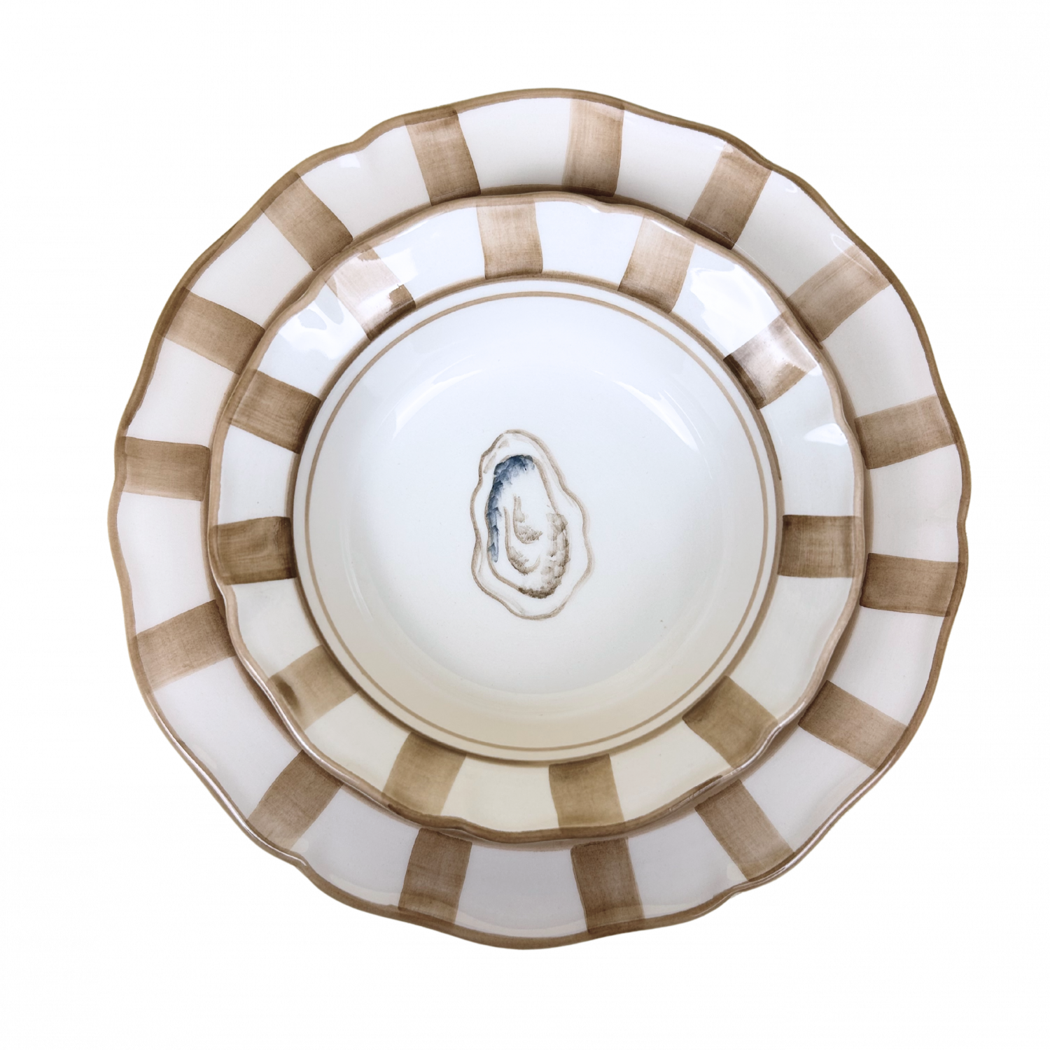 De Ostrica Serie is een elegante, luxe servieslijn met een handgeschilderde oester in het midden en een stijlvolle beige-gouden penseelstrepenrand. Deze collectie wordt volledig met de hand gemaakt in Italië en heeft een tijdloze, chique uitstraling die perfect past bij zowel dagelijks gebruik als feestelijke tafelsettings.