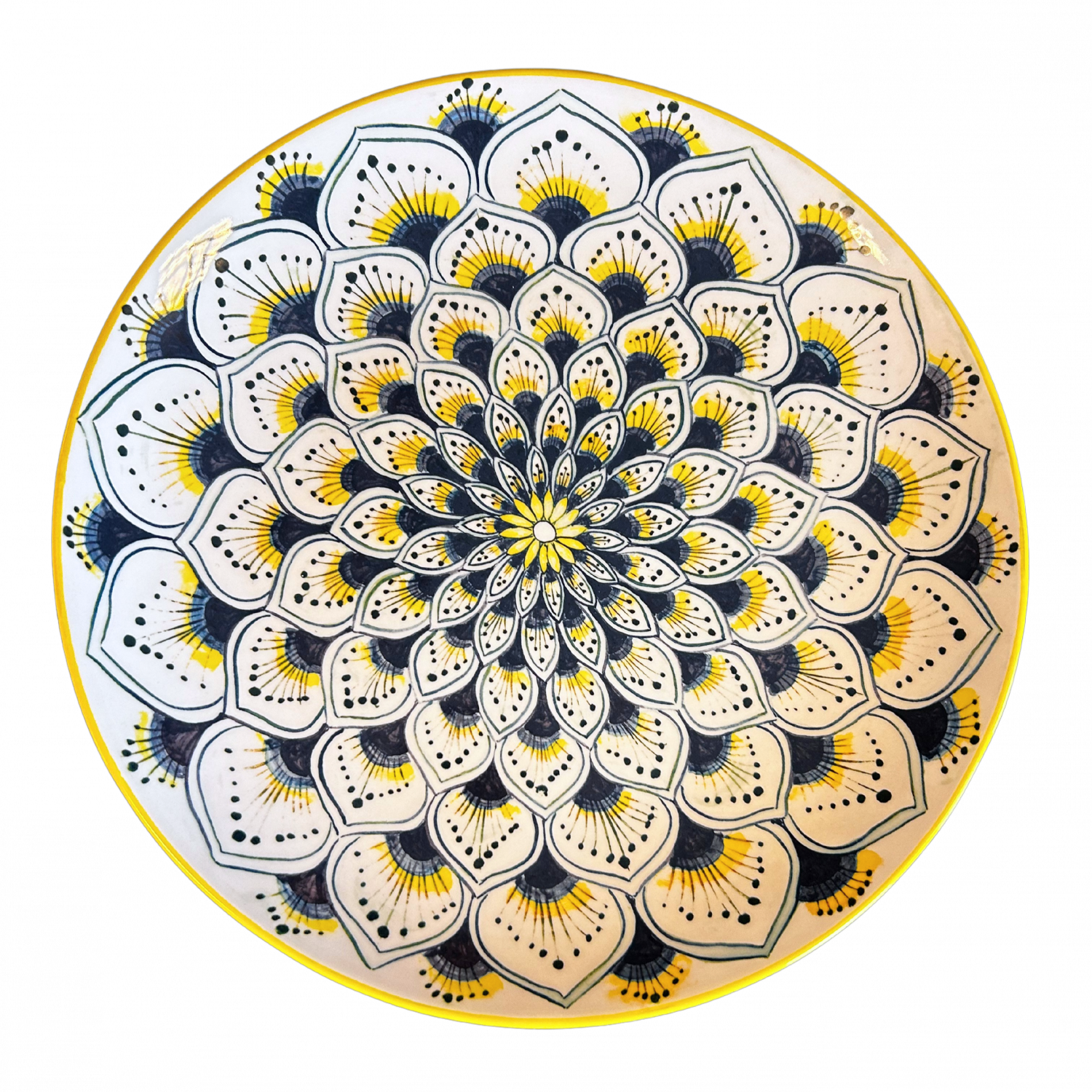 Breng Italiaanse elegantie op tafel met het Pavone Bord Blauw L uit de exclusieve collectie van Piccobella Italiaans servies. Het verfijnde patroon, geïnspireerd op de gracieuze vormen van een pauwenveer, komt schitterend tot uiting in diepe blauwtinten met levendige accenten van geel.