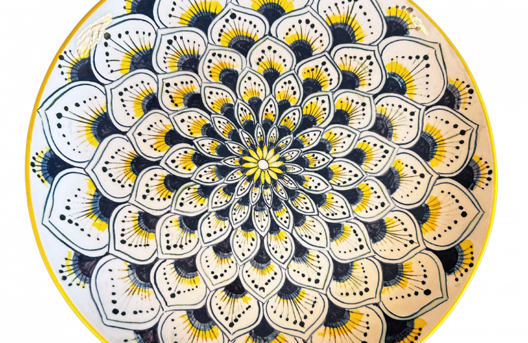 Met een royale maat van 28x28 cm is dit bord ideaal voor het serveren van hoofdgerechten, pasta’s, salades of als luxe presenteerschaal. De combinatie van rijke kleuren en ambachtelijk design maakt dit bord een echte blikvanger op tafel.