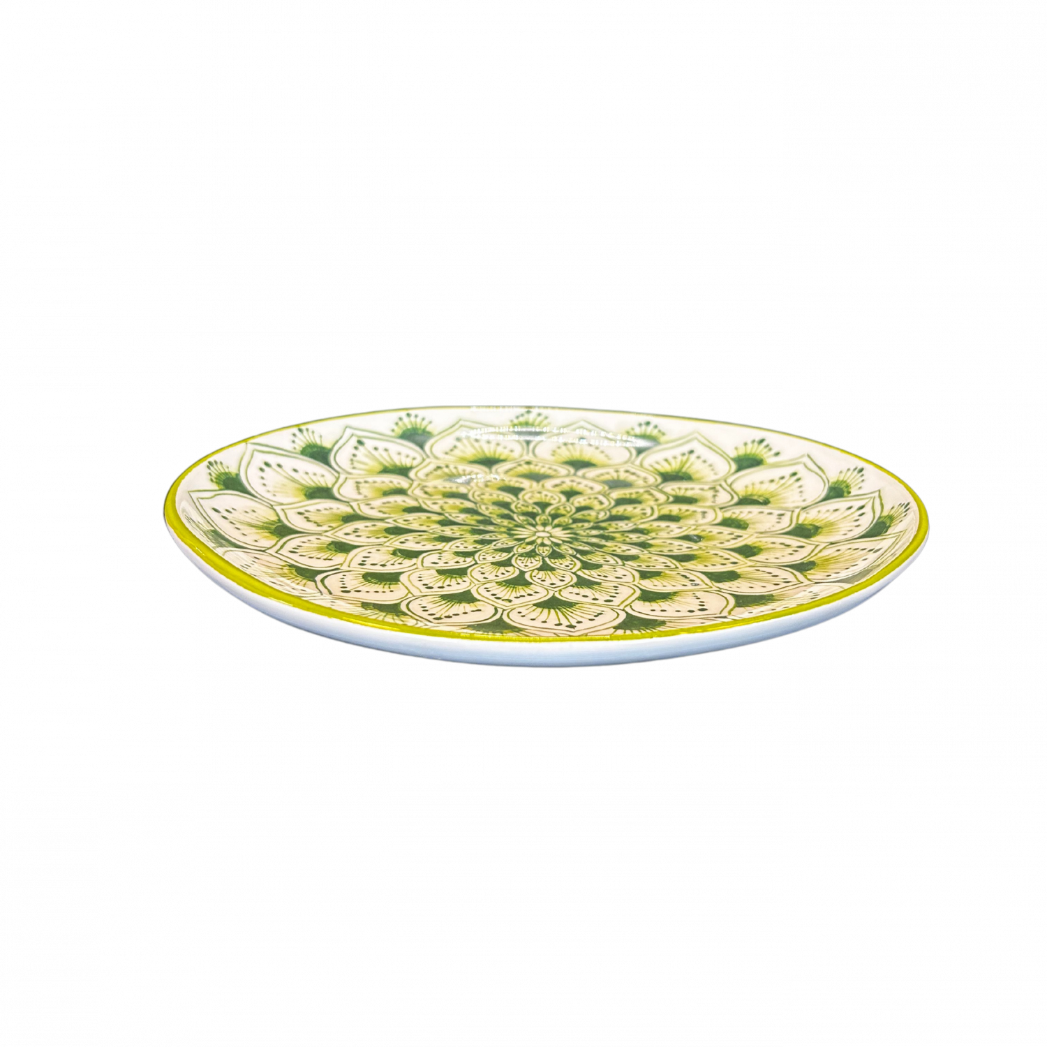 Ontdek de elegante charme van het Pavone Bord Groen M uit de exclusieve collectie van Piccobella Italiaans servies. Het verfijnde motief, geïnspireerd op de sierlijke vormen van een pauwenveer, komt prachtig tot leven in zachte groentinten met een ambachtelijke uitstraling.