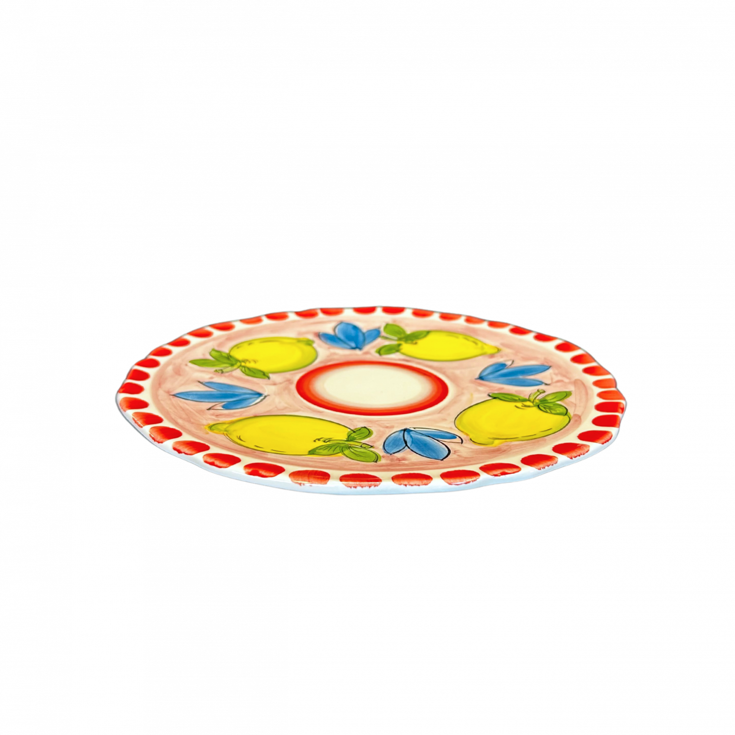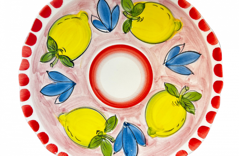 Vrolijk, kleurrijk en vol mediterrane charme – dat is het SHIM Citroen Bord M uit de levendige SHIM collectie van Piccobella Italiaans servies. Het handbeschilderde design met frisse gele citroenen, felblauwe bloemen en een speelse rode rand brengt direct de sfeer van de Amalfikust naar je tafel.
