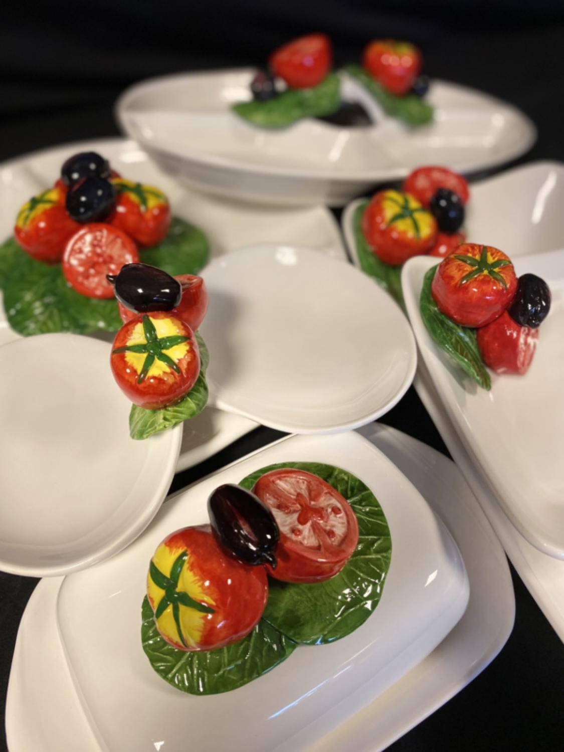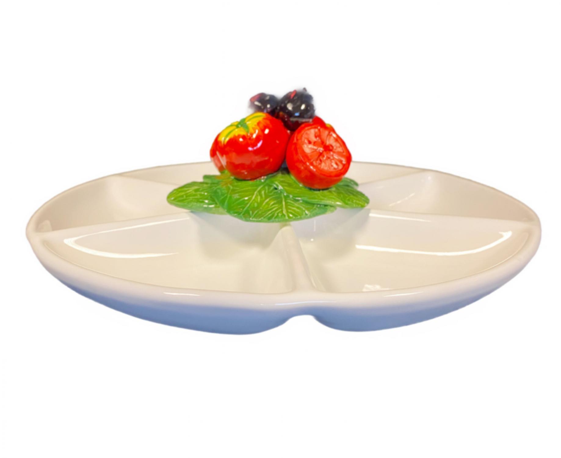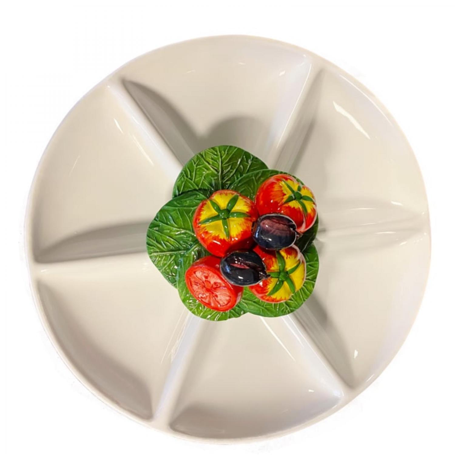 Een prachtige, handgemaakte antipasti schaal uit de Pomodoro Collectie. Met zes vakken en een vrolijke decoratie van rijpe tomaten, olijven en frisgroene bladeren is dit stuk een echte blikvanger op tafel.