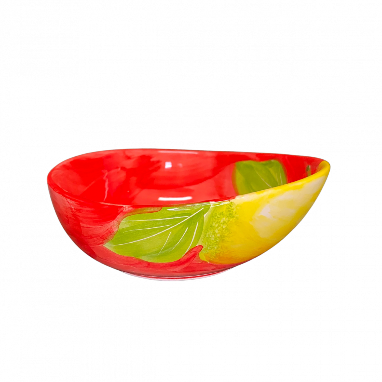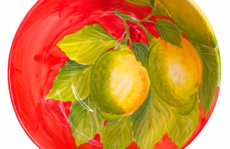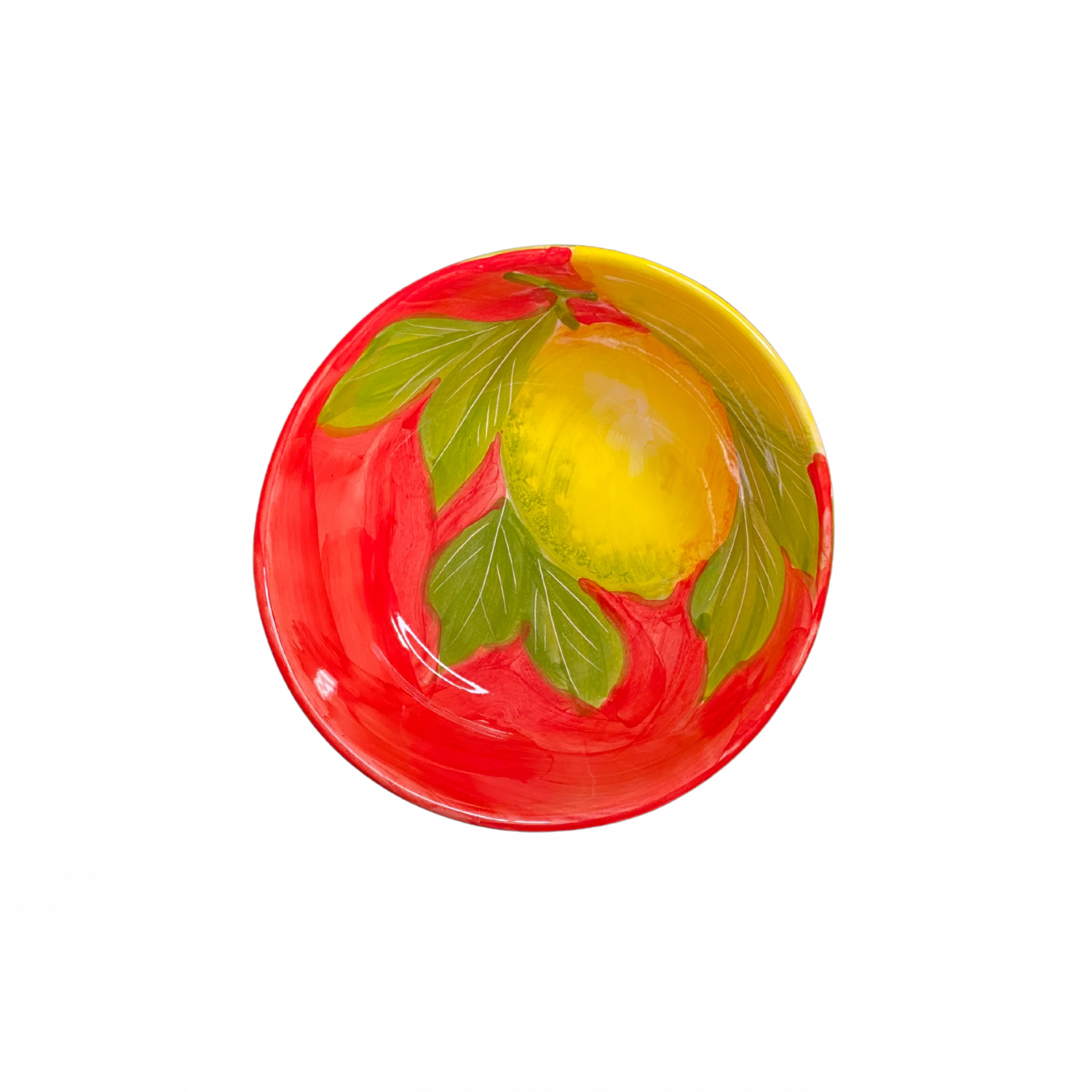 De Rosso Gadia Citroen S is een klein maar opvallend schaaltje vol kleur en Italiaanse flair. De warme rode achtergrond met handbeschilderde citroen en groene blaadjes zorgt voor een levendig geheel dat direct sfeer brengt op tafel.