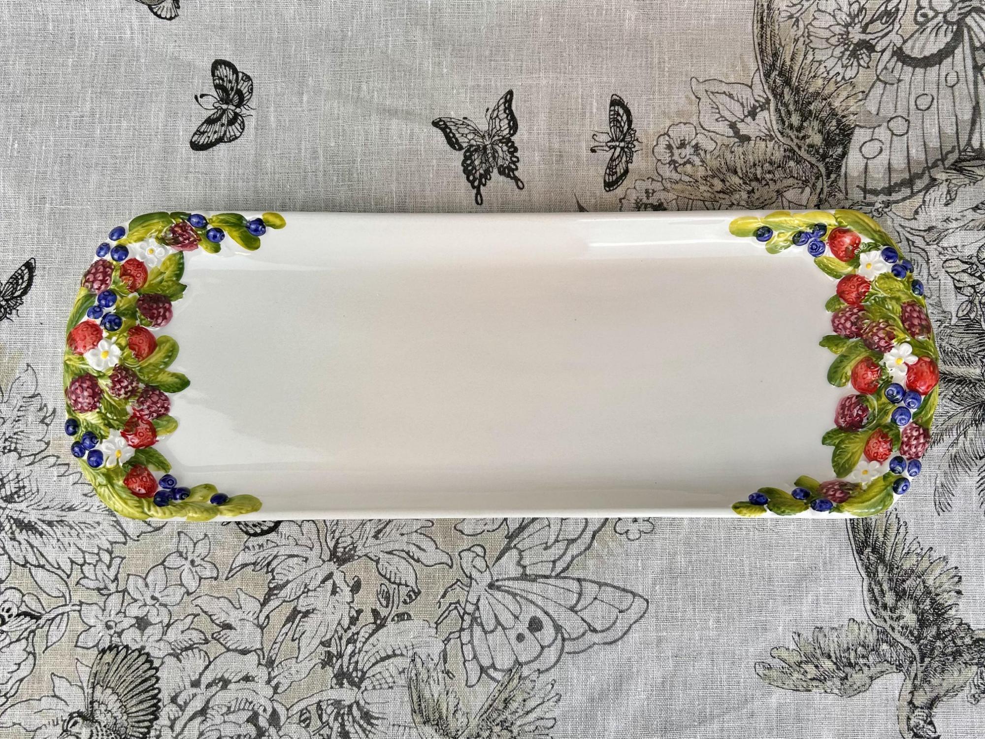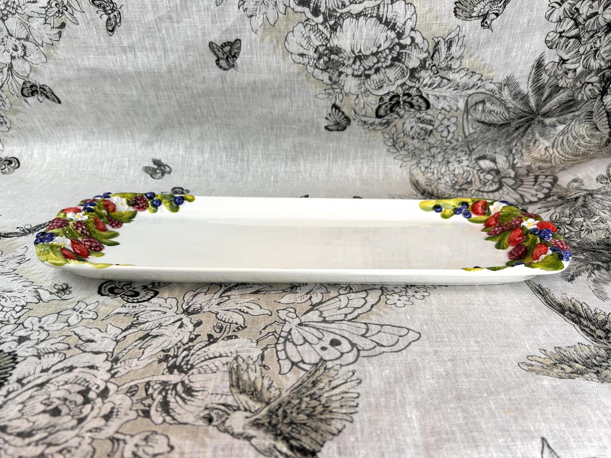 Een sfeervolle cakeschaal uit de Bosvruchten Collectie, handgemaakt en beschilderd in Italië. De decoratieve randen zijn versierd met kleurrijke bessen, bramen, frambozen en bladeren, wat zorgt voor een fris en zomers geheel.