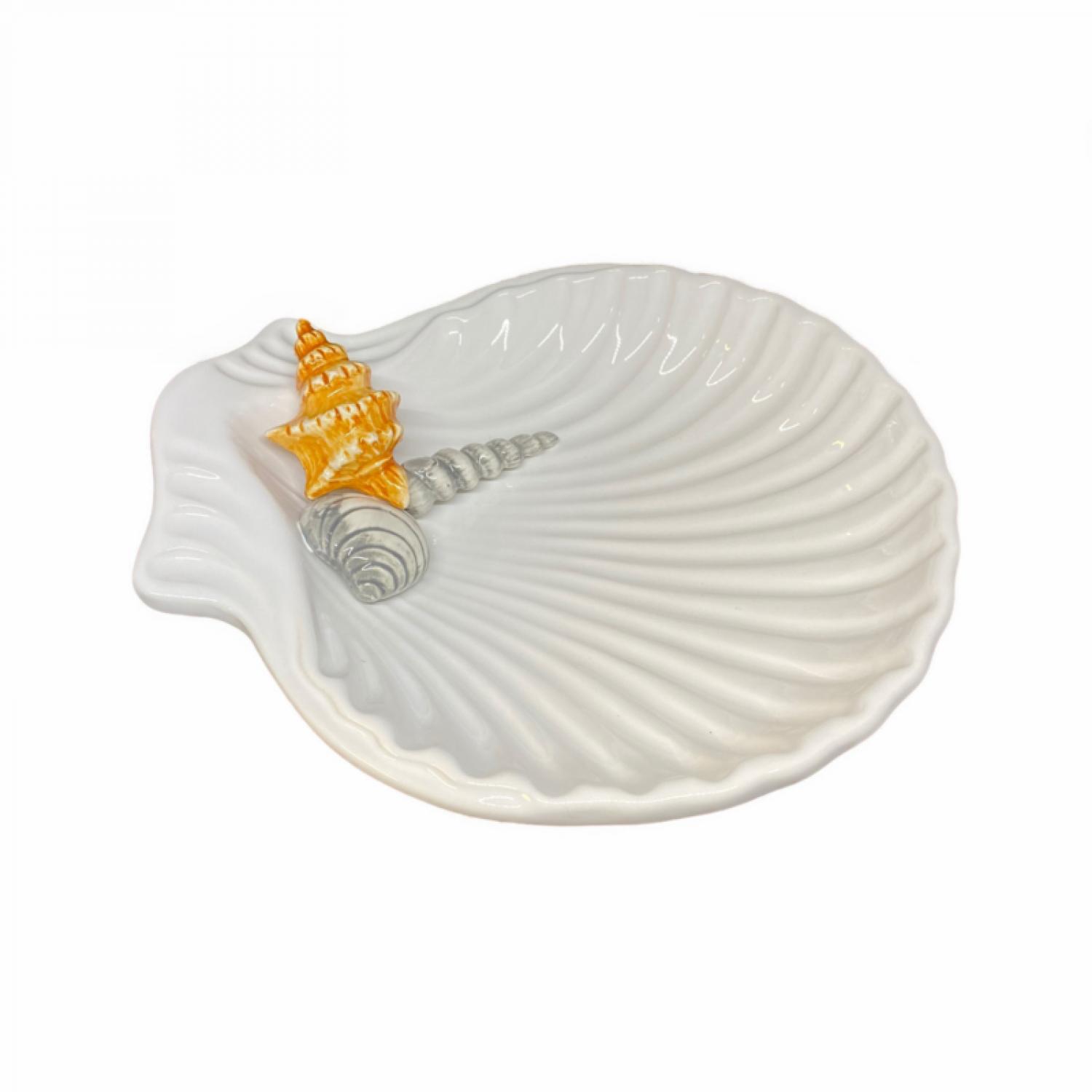 Een elegante schelpschaal uit de Mare Collectie, met de hand gemaakt en beschilderd in Italië. De verfijnde witte schelp is versierd met kleine zee-accenten zoals een schelpje, zeester en krabbetje in zachte tinten — een subtiele knipoog naar de mediterrane kust.