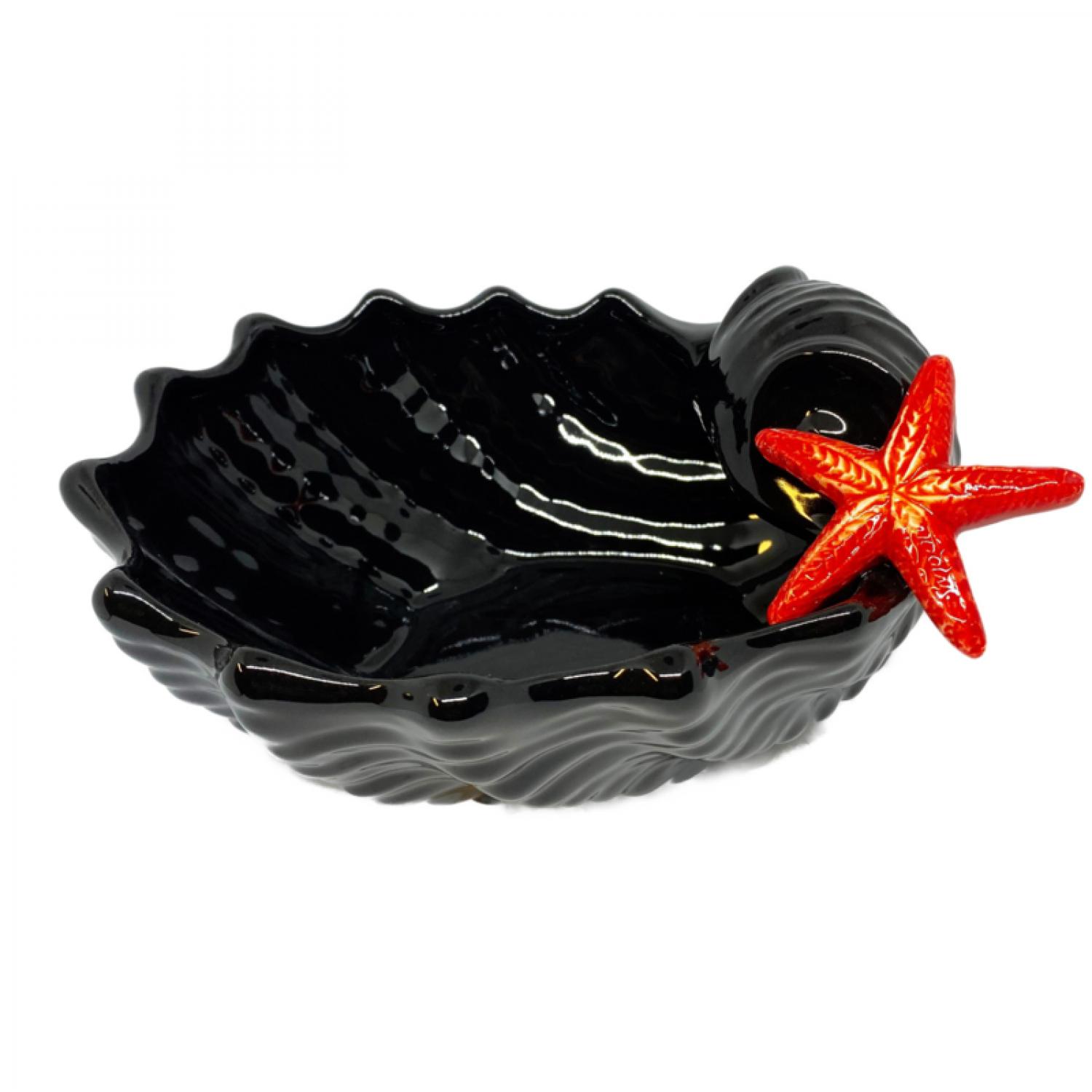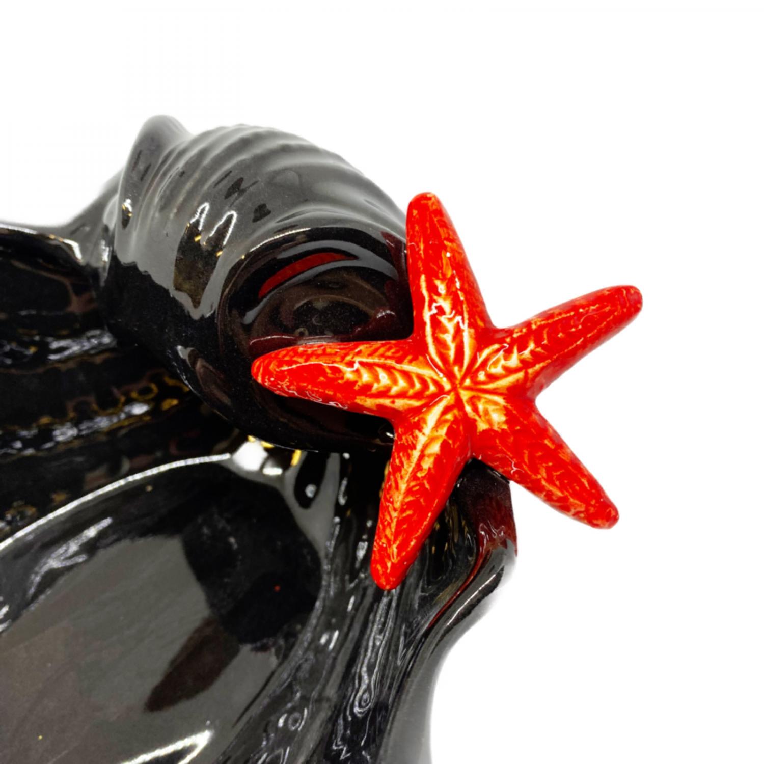 Een elegante en opvallende schelpschaal uit de Mare Nero Collectie, handgemaakt en beschilderd in Italië. De diepe zwarte glans vormt een prachtig contrast met de felrode zeester, waardoor dit stuk een moderne en luxueuze uitstraling krijgt.