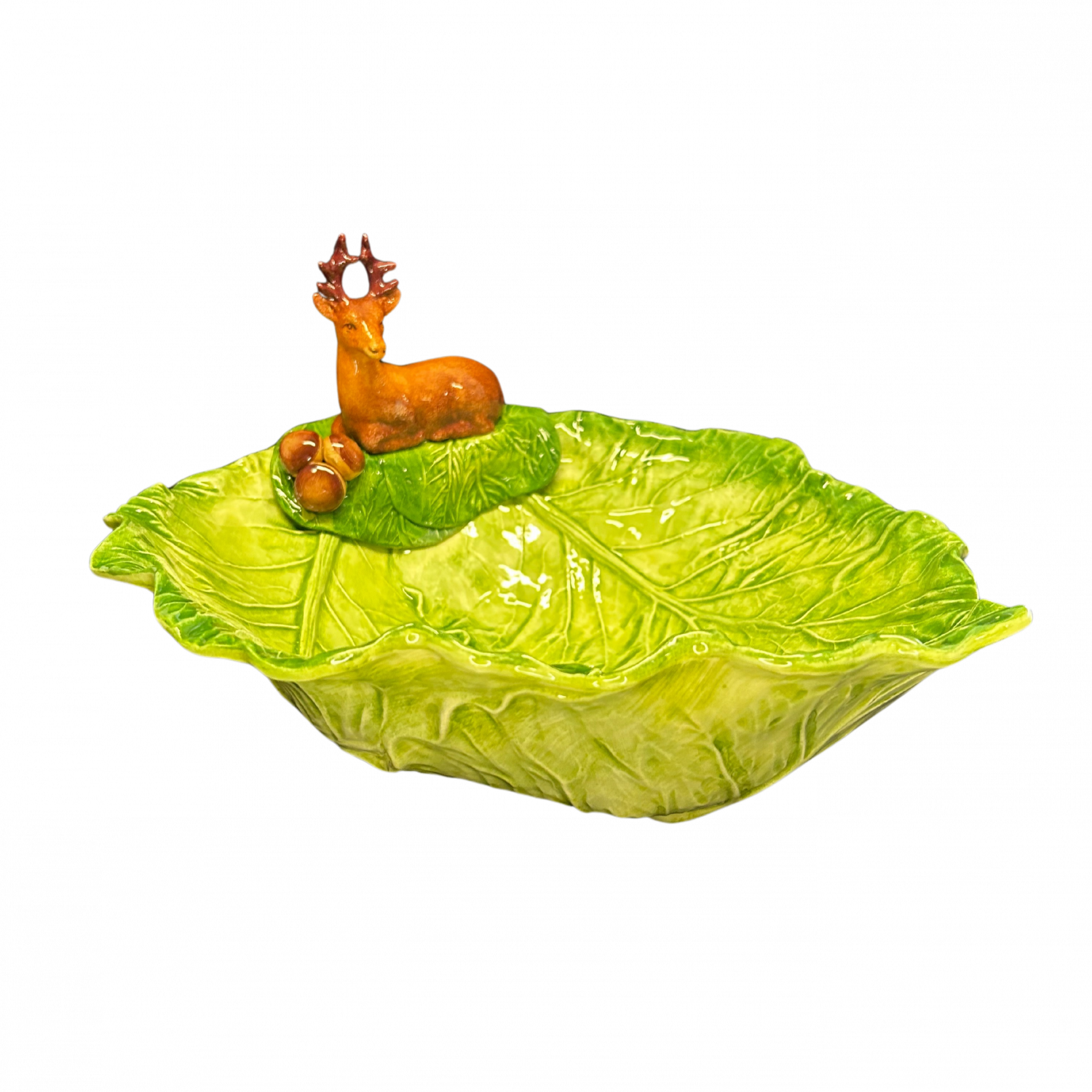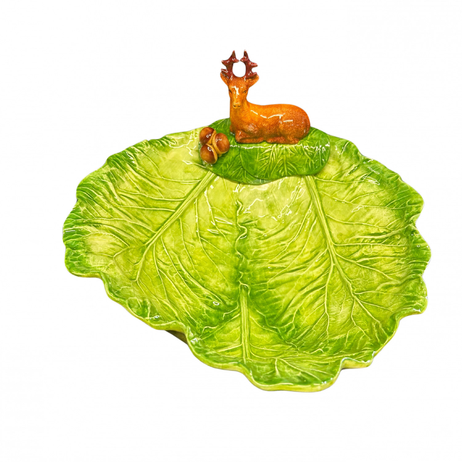 Maak je herfst- en wintertafel extra bijzonder met de Siena Groene Schaal Hert uit de sfeervolle Siena collectie van Piccobella Italiaans servies. Deze handbeschilderde schaal in de vorm van een groot koolblad is voorzien van een prachtig hert-figuurtje dat speels en stijlvol bovenop de schaal prijkt.