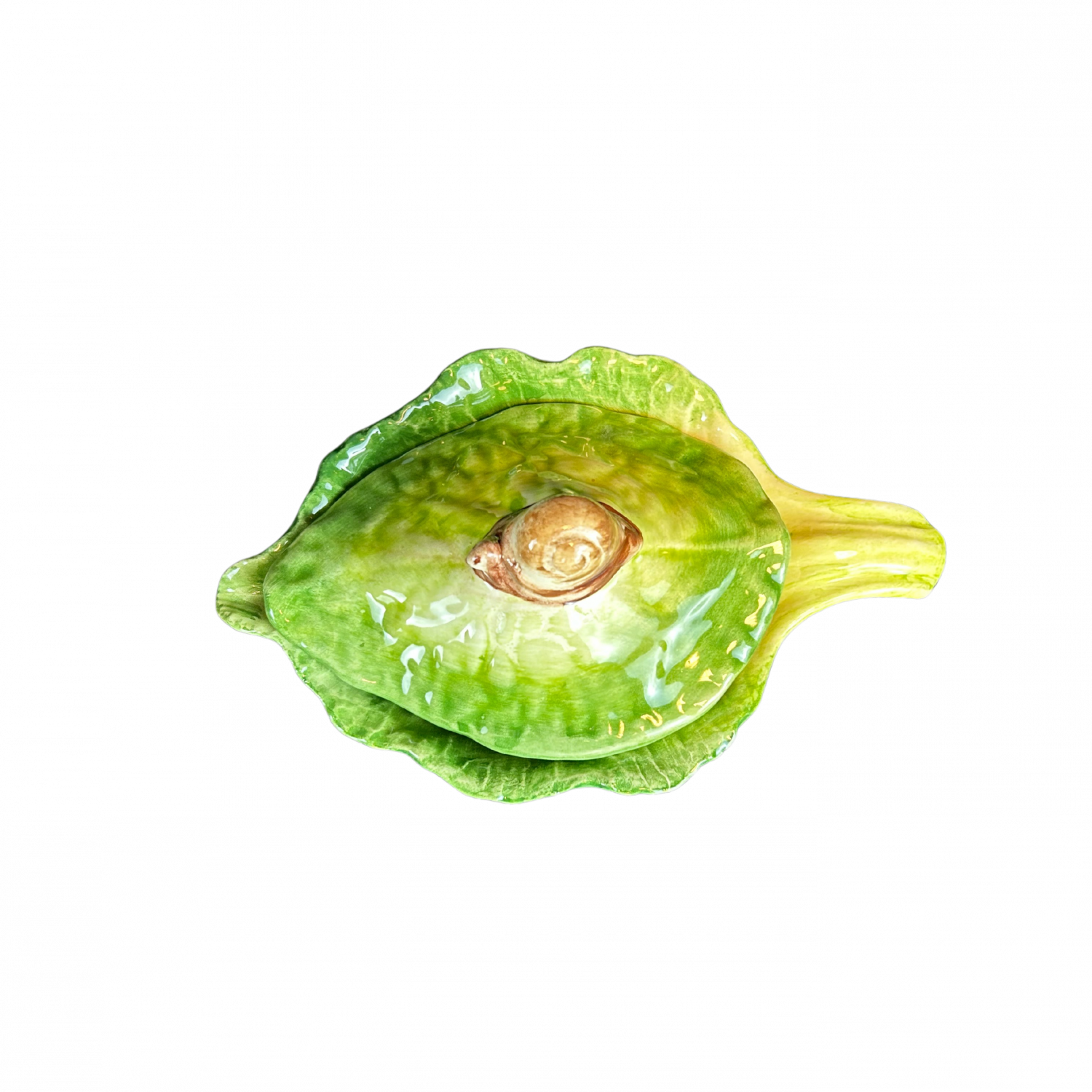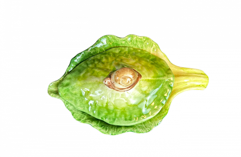 Voeg een speels en charmant detail toe aan tafel met het Escargot/Slak Schaaltje met Deksel van Piccobella Italiaans servies. Dit bijzondere schaaltje is vormgegeven als een frisse groene koolblad-schaal, afgewerkt met een schattige slak op het deksel.