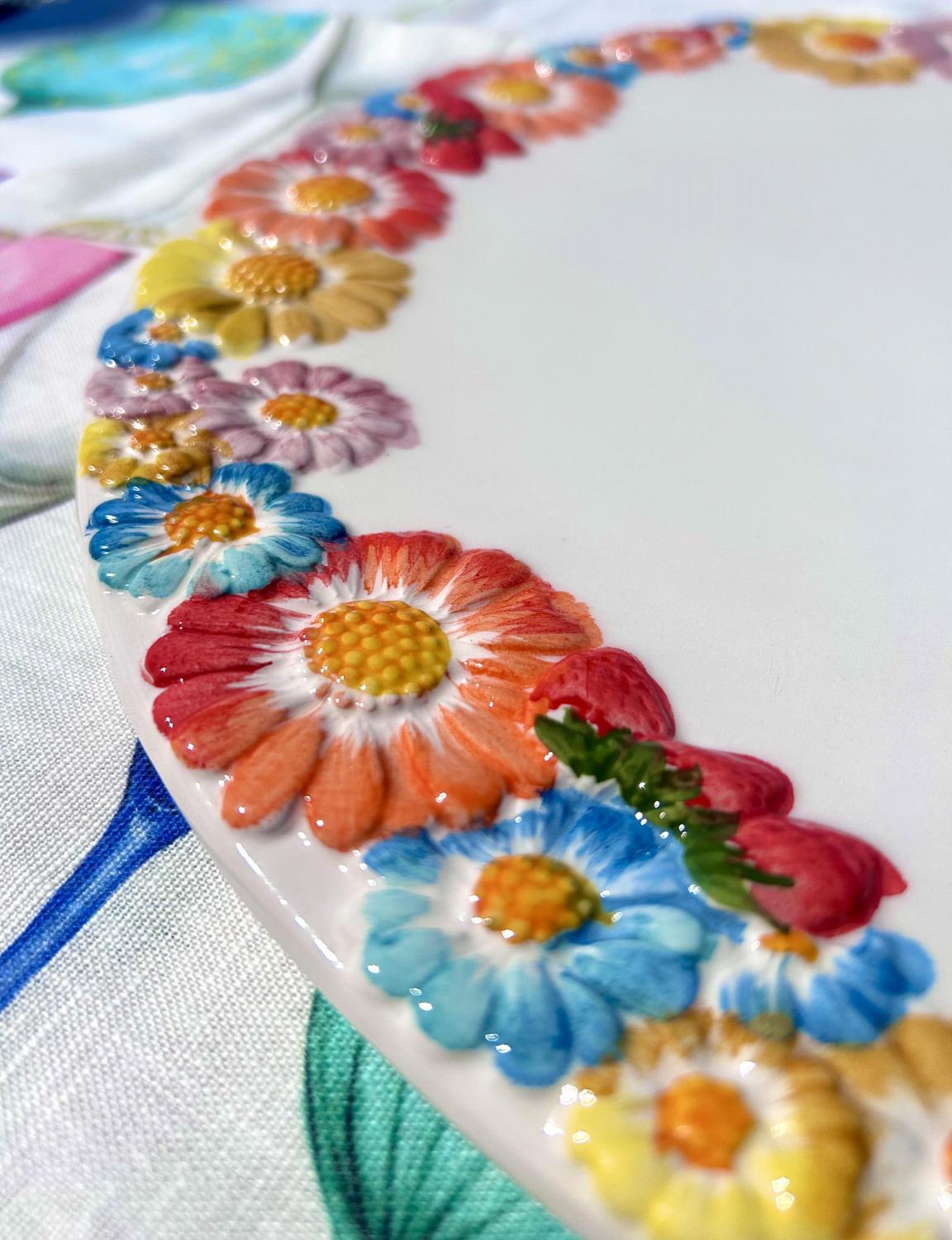 Maak van elk koffiemoment een feestje met de kleurrijke Fiori Colorati taartschaal van Piccobella. Deze royale schaal is rondom versierd met handbeschilderde bloemen in vrolijke kleuren, waardoor hij een echte blikvanger is op tafel. Perfect voor het serveren van taarten, cakes of hartige quiches.