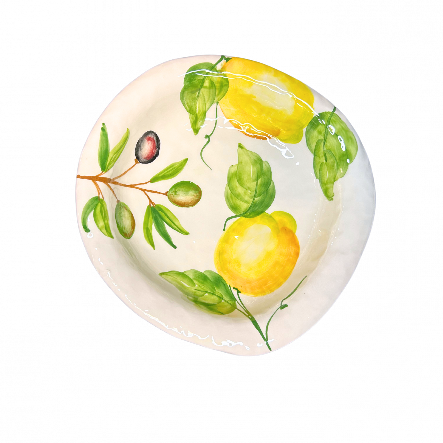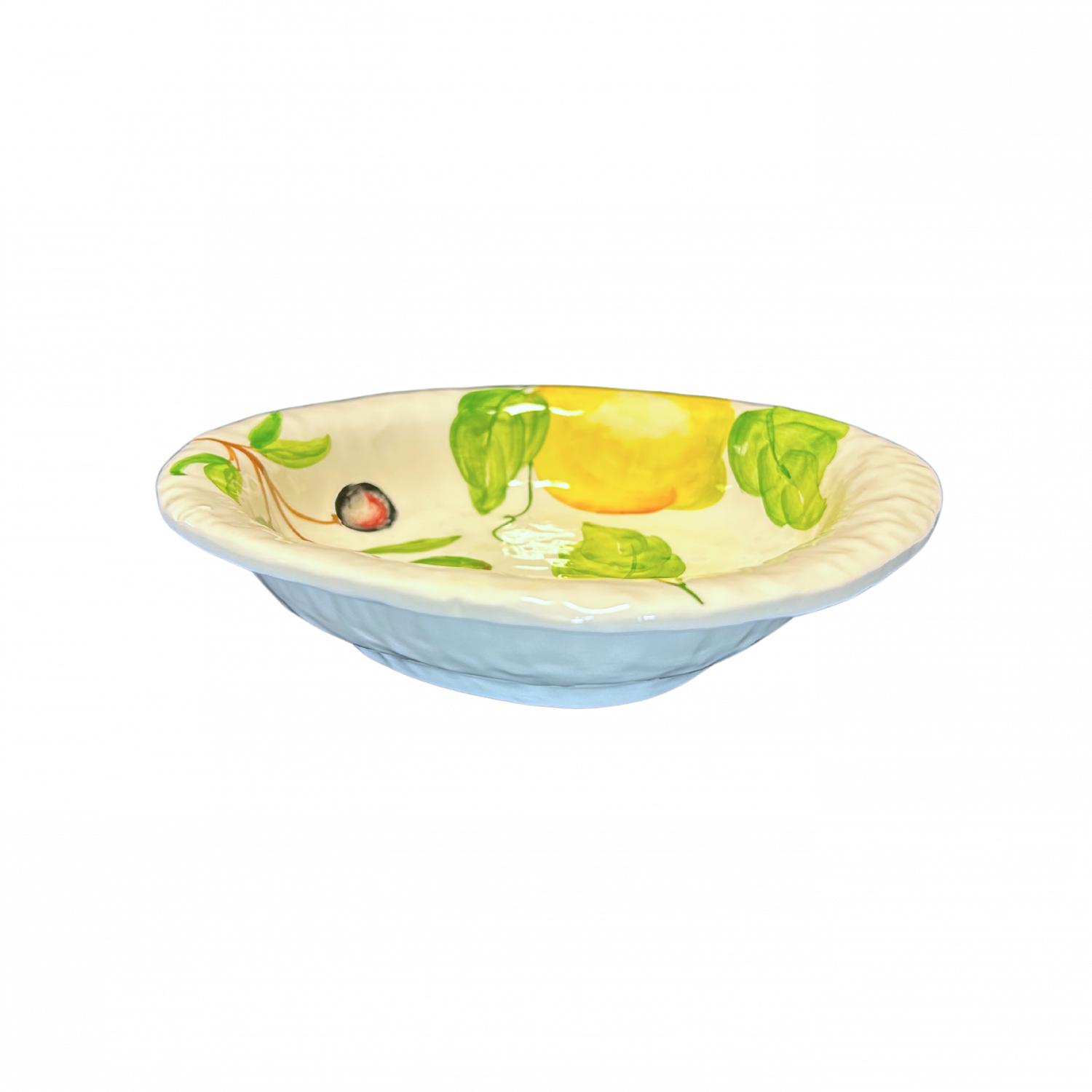 Breng de mediterrane sfeer naar tafel met de Turijn Olijf Citroen Kom met Reliëf uit de collectie van Piccobella Italiaans servies. Deze handbeschilderde kom is rijk gedecoreerd met zonnige citroenen en olijven, omlijst door frisgroene bladeren. Het subtiele reliëf geeft de schaal een ambachtelijke en luxe uitstraling.