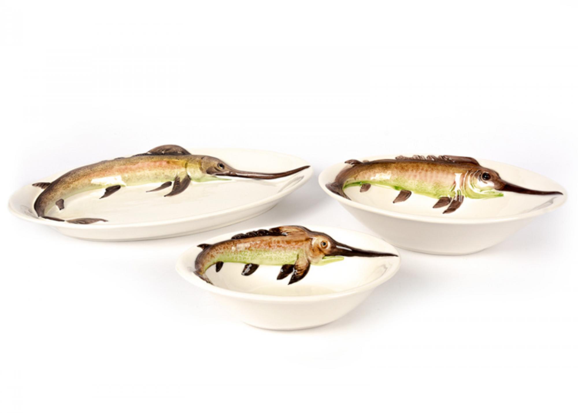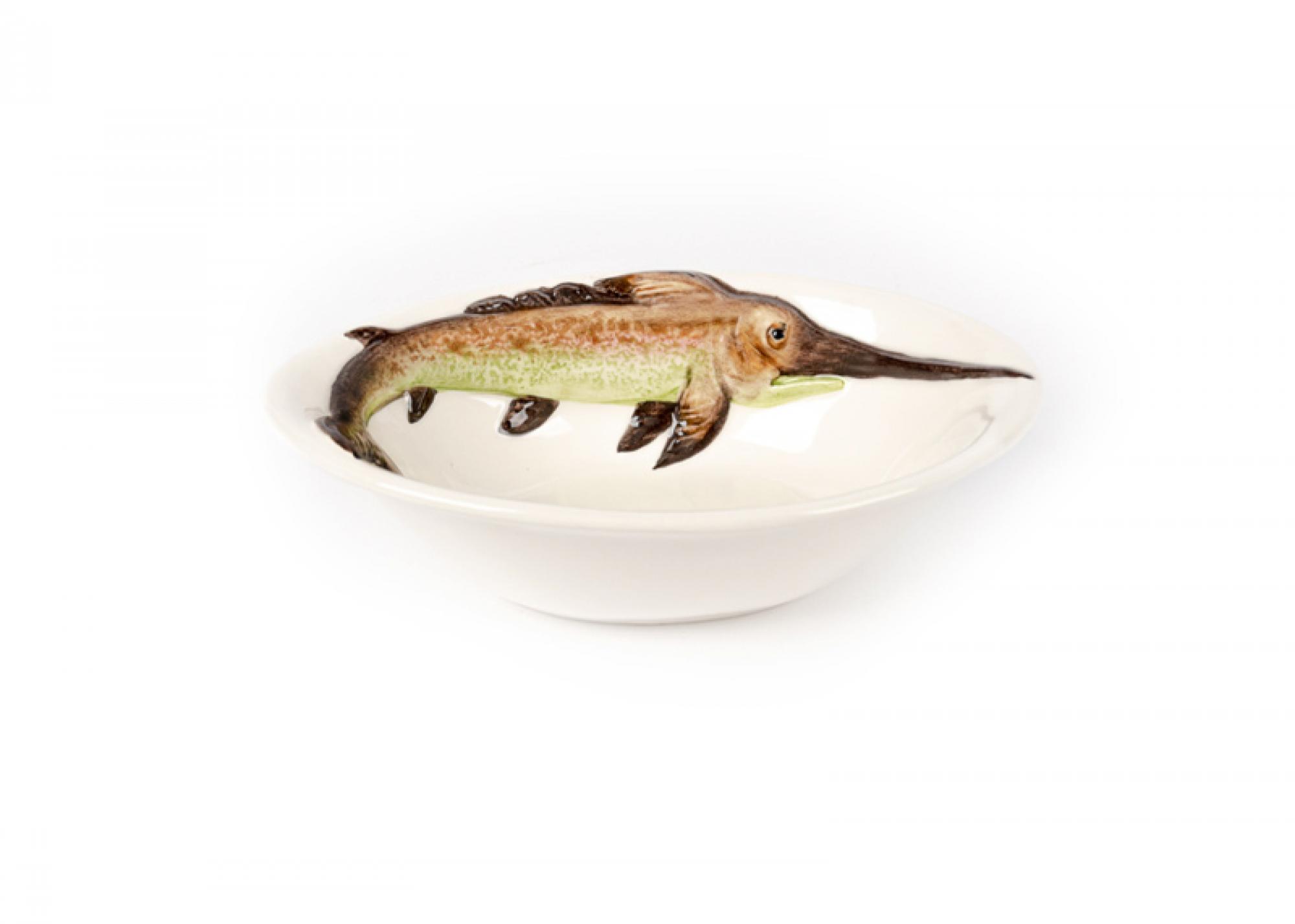 Het Zwaardvis Schaaltje Diep Klein is een charmant en handbeschilderd schaaltje met een gedetailleerde zwaardvis langs de rand. De zachte kleuren en subtiele glans geven dit stuk een verfijnde, maritieme uitstraling.